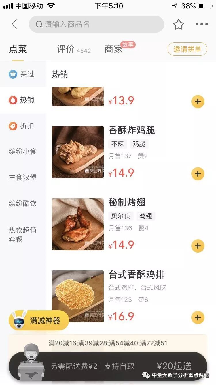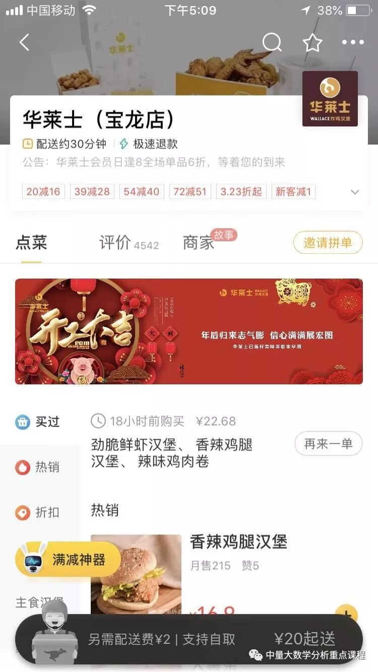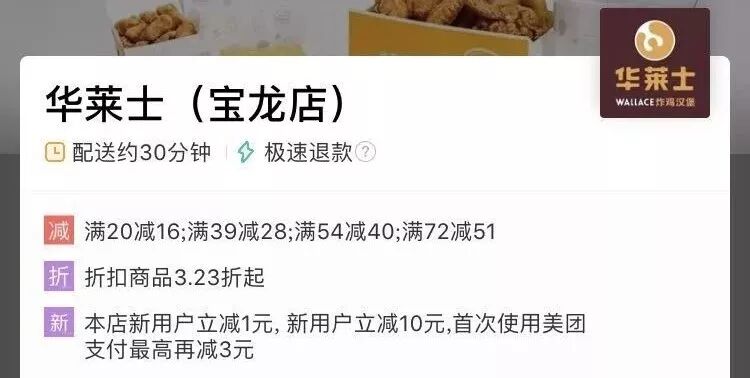 然后涨完价之后怎么办?商家来满减呀,比如我们的宝藏店家华莱士,满20减16,满39减28,满54减40,满72减51!