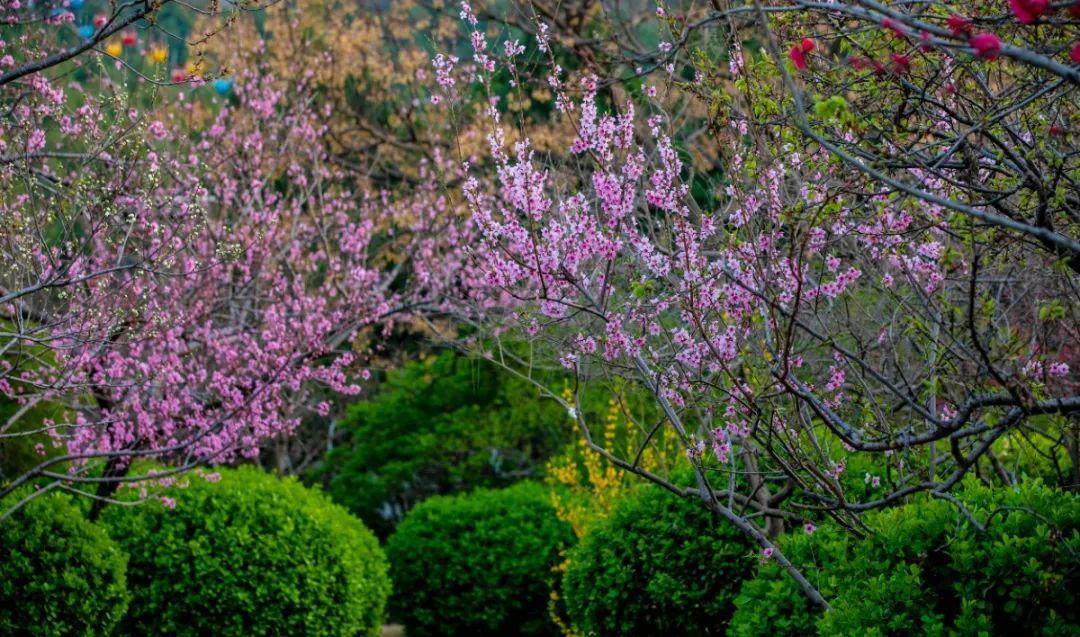 园内榆叶梅、美人梅、郁金香、碧桃、樱花、海棠等正次第开放,春色满园。郁金香花色繁多,三万余株牡丹、芍药争相盛开。