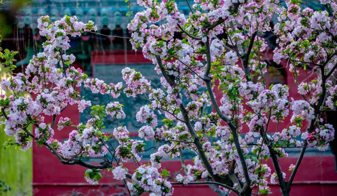 四月初,海棠花开满红叶谷的各个角落,尤其是位于兴教寺附近的海棠园,里面高低错落种植了芭蕾舞海棠、垂丝海棠、冬红果海棠、红丽海棠等十几种海棠花。
