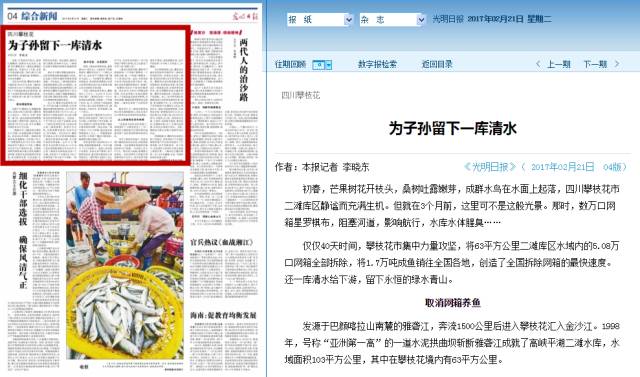 2月21日,《光明日报》刊发题为“为子孙留下一库清水”的文章,对攀枝花市取消二滩库区网箱养鱼工作的成功经验进行了报道。