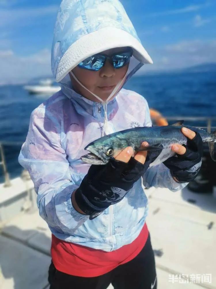 9岁钓友杨智栋,也有收获,钓上一条鲅鱼。