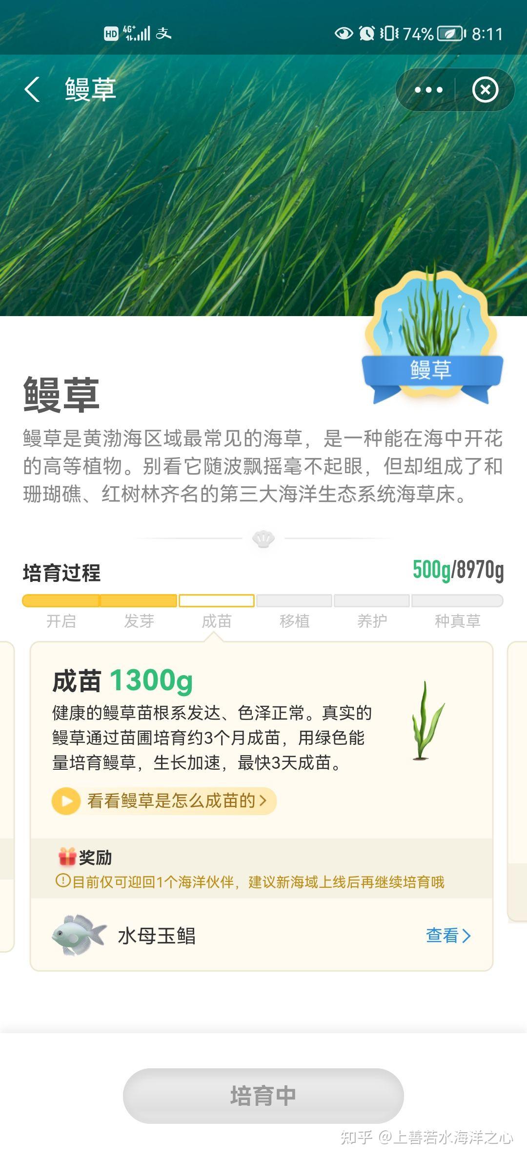在神奇海洋中种1株鳗草共需6个阶段,要经历开启、发芽、成苗、移植、养护和种真草共6个阶段8970g绿色能量,各阶段所需要绿色能量如下: