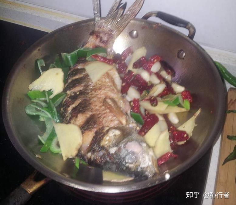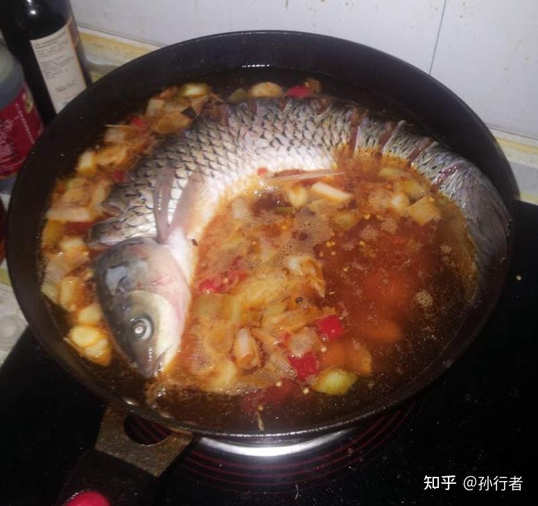 下面这个是做的红烧鲤鱼,把鲤鱼表面涂抹少量淀粉,在锅里煎成两面金黄,葱姜蒜花椒,八角爆香,辣椒爆香,加料酒、生抽、红烧酱油、少量大酱,加水