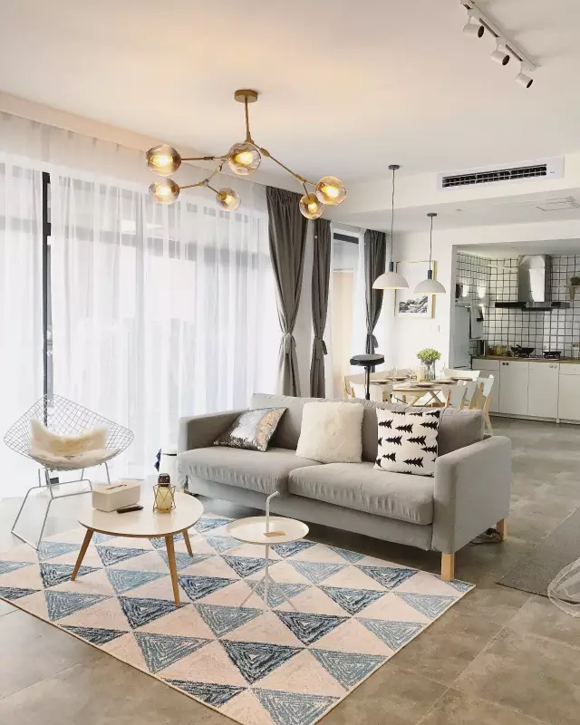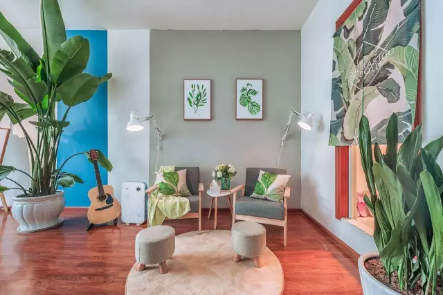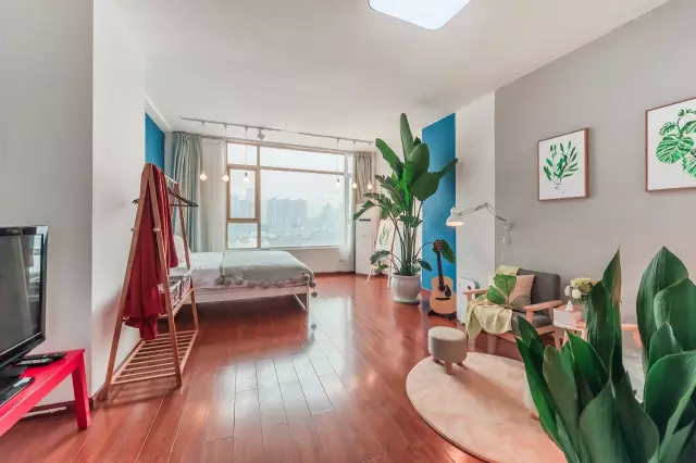 客厅带落地窗,哈曼卡顿蓝牙音箱、坚果投影仪,这样可以享受家庭影院,更带感