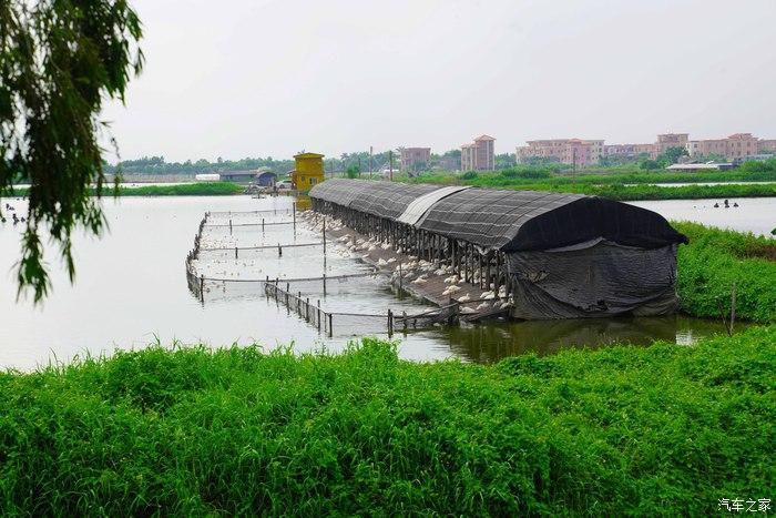 而堤坝的另一边是特有的沙鸥田园农场,这里有田地、荷塘、村屋,以及许多鸭子和果树林,一路上到处可见的大鱼塘,和鱼塘两边的小木屋。