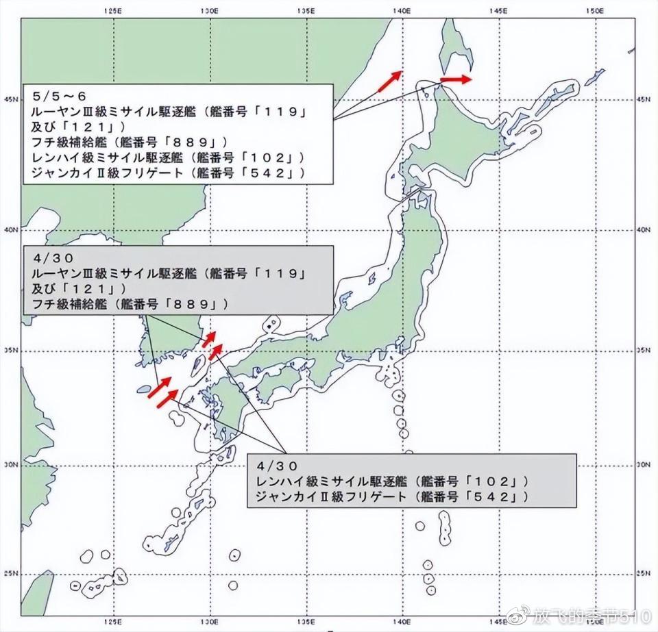 5月6日,已经从日本海穿越宗谷海峡的102海上编队,成员包括102“拉萨”舰(055型驱逐舰)、119“贵阳”舰和121“齐齐哈尔”舰(052D型驱逐舰)、542“枣庄”舰(054A 型护卫舰)、889“太湖”舰(903A型综合补给舰),沿宗谷海峡向东航行。