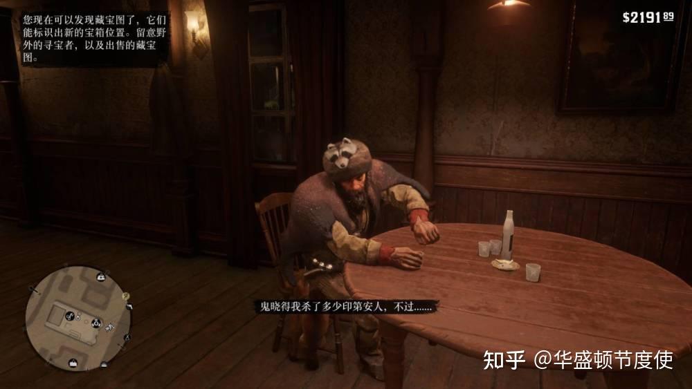 在瓦伦丁酒馆,会随机遇到一个彪形大汉,他生前和一个浣熊有着很深的情谊,然后在它死后就把它做成一顶帽子与他终身相伴,在剧院放的一部小电影里好像有提到这个人和他帽子的事,电影名字叫做约西亚•黑水(也许这个就是他的名字?我之前没仔细看过,最近想去看也没有刷出来这部片子)。