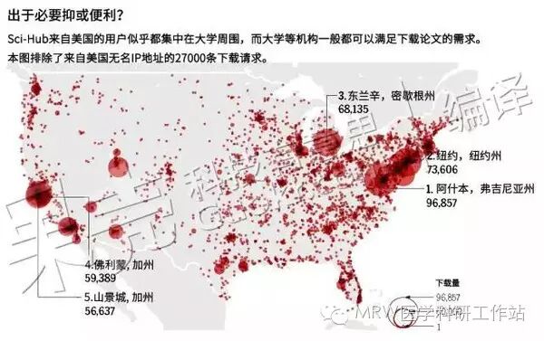 在美国和欧洲,Sci-Hub用户集中在科研人员们工作的地方。在这六个月期间,74000个下载请求来自纽约市——多所综合性大学和科研机构坐落的地方。19000个下载请求来在哥伦布(Columbus),一个人口不到纽约十分之一的城市, 68000个下载请求来自密歇根州的东兰辛(East Lansing),这里的人口少于纽约的百分之一。这两个地方分别是俄亥俄州立大学和密歇根州立大学的老家。