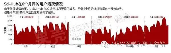 Sci-Hub上的活动周期还反映了研究人员们的工作生活,流量在白天持续增多,随着夜幕降临逐渐减少,但从不停止。(数据中有一个从2015年11月4日开始的为期18天的缺口,因为当时sci-hub.org下线了,期间的服务器日志没有调试好。)到二月底,Sci-Hub上的论文流量上升到了迄今为止的最高水平:每天超过20万个下载请求。