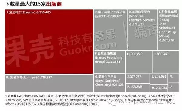 在Sci-Hub上被下载量最大的15个文献来源出版方。