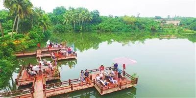 海口世外桃源休闲养生区(墩插村)墩插村位于海南古镇旧州,村内设有“梦里水乡”用餐平台,傍晚围聚在水上平台吃饭,微风从湖面上吹来,晚霞绮丽多姿,看着月亮缓缓升起来,品尝着原生态美食,让客人在此找回人与自然的淳朴关系。