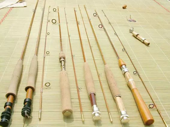 5.在每节插入上一竿节的部位,用结实的线类缠约5-6cm长加固处理。做好的竿阴干后用清漆刷竿子几遍。到渔具店去买鱼线、鱼钩、坠子;鱼漂,可以找杀鸭鹅时褪下的羽毛梗剪成2cm左右一节来作浮子,一般用七个成七星漂。装上线组,这样竹钓竿就成了。