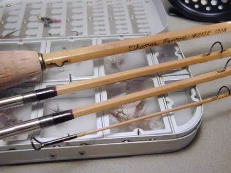 4.将后二节打通(用工具从两头钻竹节,钻通了再扩大,最后把竹竿内空完全锉光滑),竿尖装入二节、二节装入尾节,收竿长约1.7米。