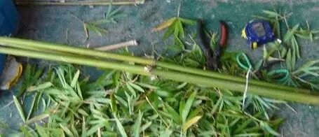 3.取下竹子,裁出各1.6、1.7米长的两段,然后裁出尖子一节在1米长。