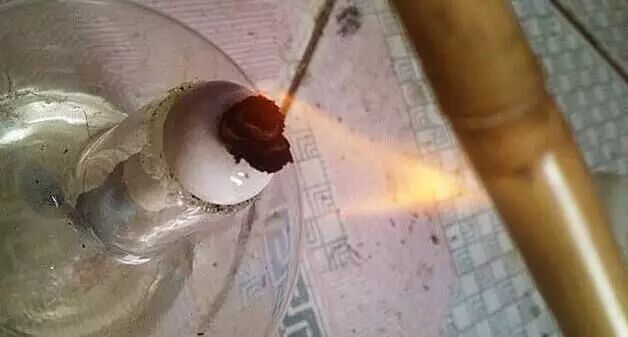 2.用小火炉来烤每个竹节处,使每节都变得很直,烤了的竹节处用凉水淋使其定型。然后用合适的重物吊于竹尖,倒着悬挂几天。