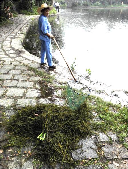 为主,对落叶浮渣及泛滥水生植物进行打捞,以及定期投加药剂来抑制藻类疯长。