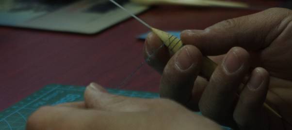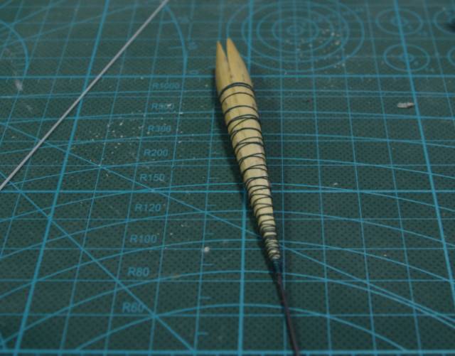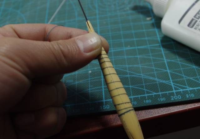 8.涂胶绑线。根据事先设计好的长度裁出标尾和标脚,插入标身内2.5厘米左右的位置,见下图。