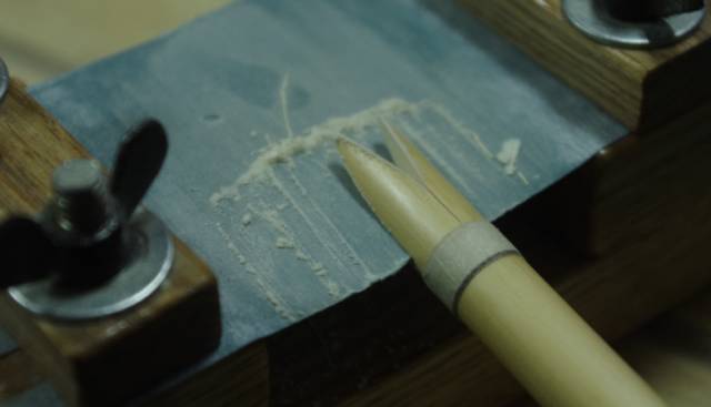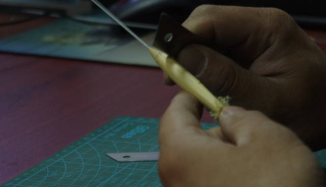10.拆线后,用刀片刮去芦苇的表皮和残留的胶水,为打磨做准备。
