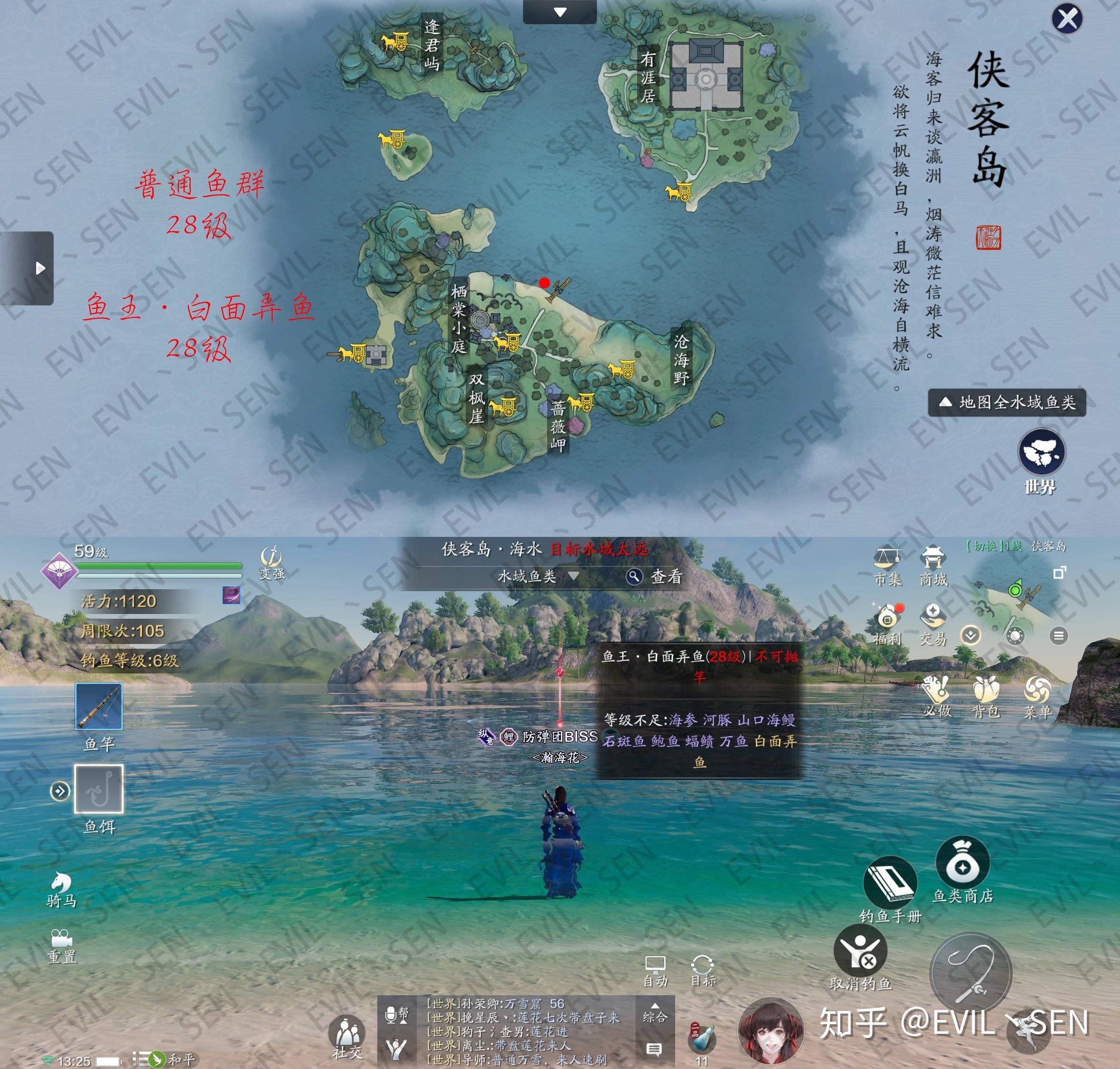 侠客岛的普通鱼群等级为海水28级,栖堂小亭长桥处有28级鱼王·白面弄鱼。
