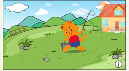 一个风和日丽的早晨,瓦蓝的天空中飘着几朵棉花糖似的白云,远处的青山连绵不绝,就好像给大地盖上了一层碧绿的毛毯,非常壮观。小猫喜笑颜开地走出了家门,它一手提水桶,一手扛鱼竿,迈着大步向清澈的小河走去。