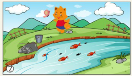 走着走着,小猫终于走到了小河边,它放下装满鱼饵的水桶,拿出一个鱼饵绑在鱼竿上,小猫举起鱼竿,把鱼杆竿放在水里。过了很久,鱼终于游过来了,这时,一只漂亮的小蝴蝶飞了过来,围着小猫转啊转,一会儿飞到上面,一会儿飞到下面,一会儿转圈圈,好像一位跳舞的小姑娘。小猫被蝴蝶吸引住了,目光朝小蝴蝶看去,小猫心想:反正我一条鱼也没有钓到,不如跟小蝴蝶一起去玩吧!