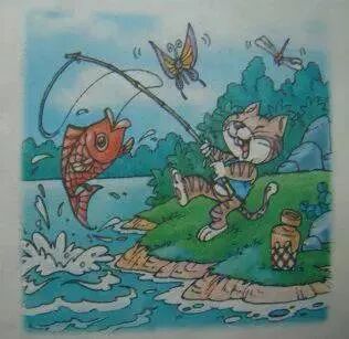 小猫想:我今天是来钓鱼的,不是来捉蜻蜓和蝴蝶的。小猫决定认真地钓鱼。最后,小猫终于钓到了一条活蹦乱跳的的大鱼。