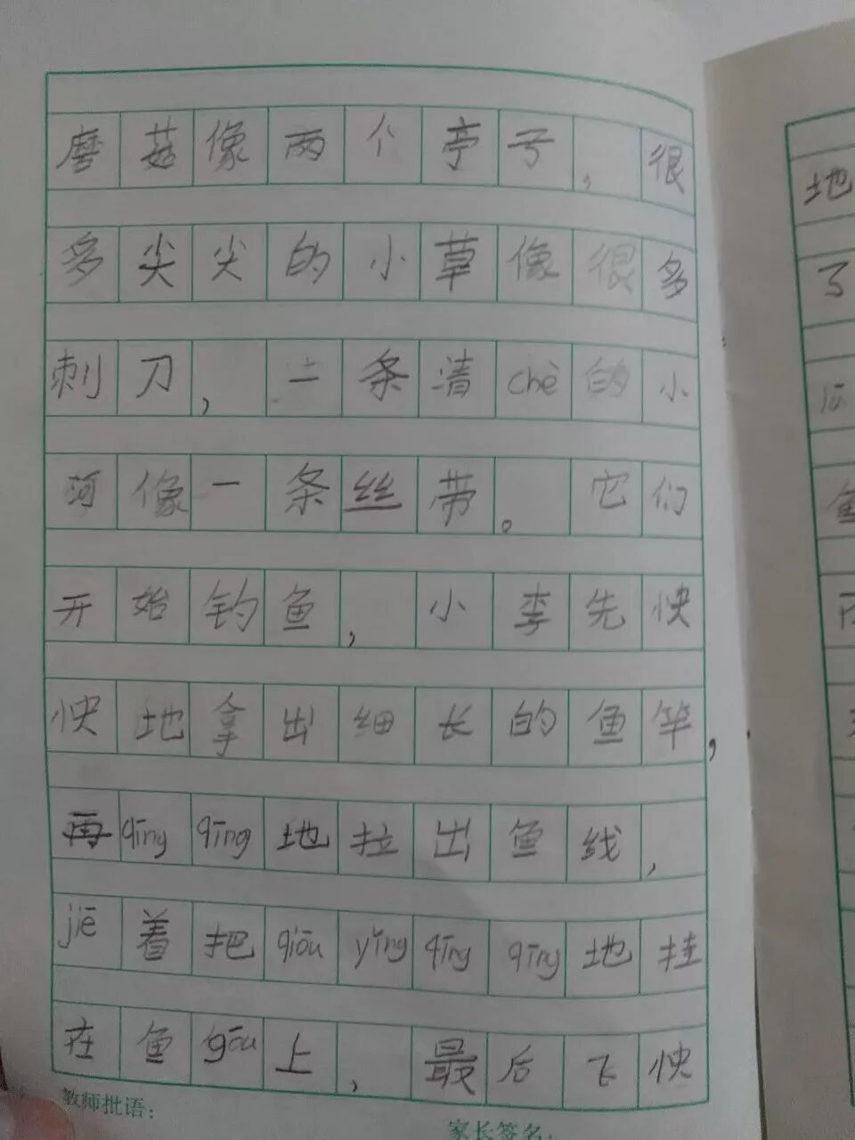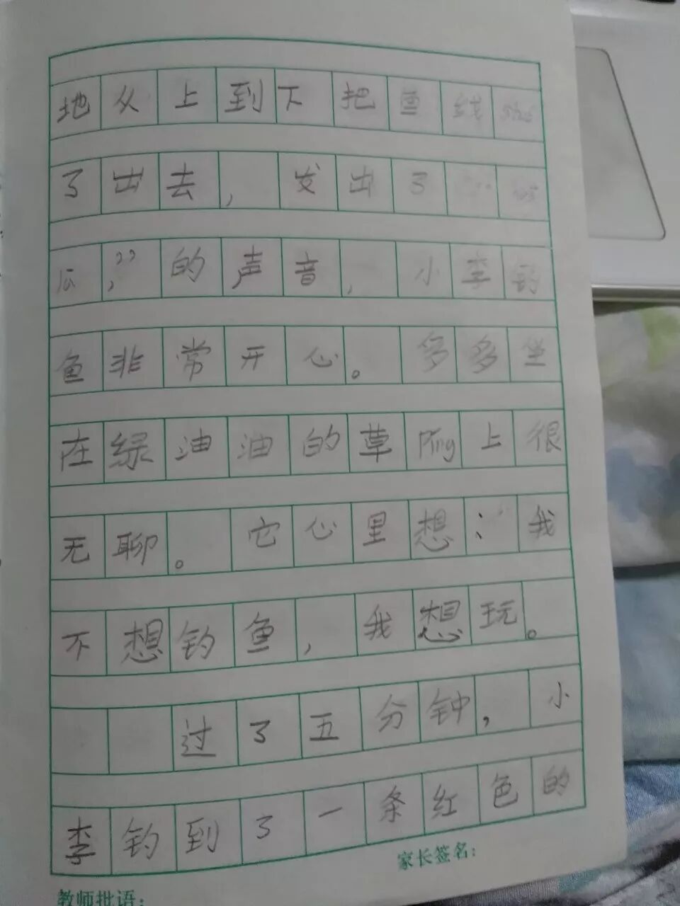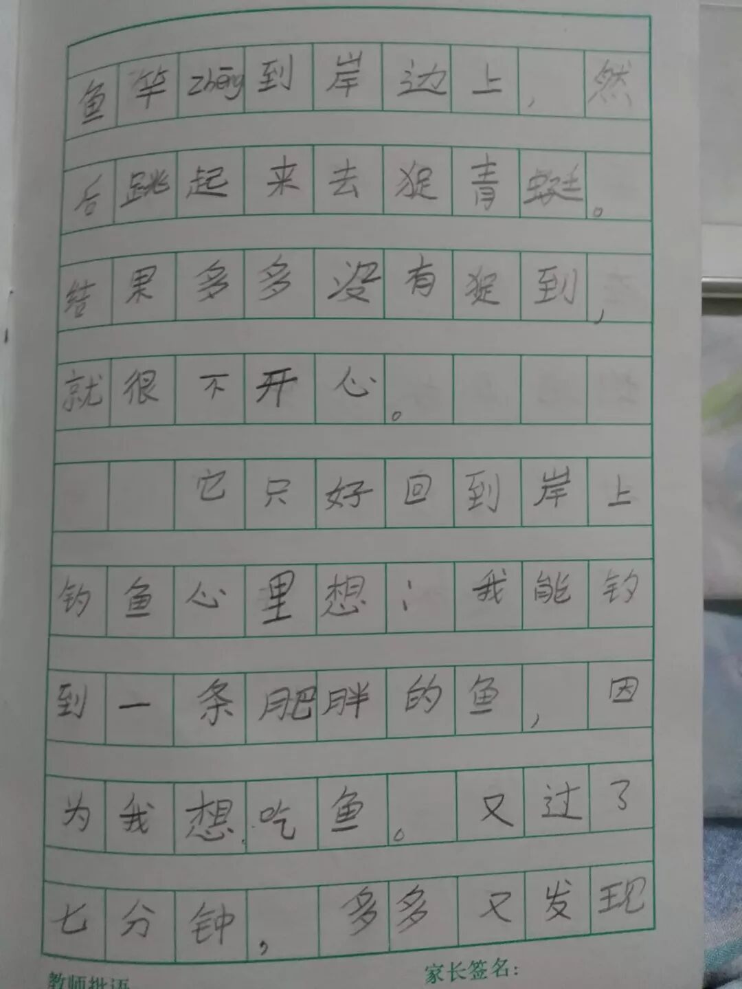它们来到弯弯的小河边,有两个小小蘑菇像两个亭子,很多尖尖的小草像很多刺刀,一条清澈的小河像一条丝带。它们开始钓鱼,小李先快快地拿出细长的鱼竿,再轻轻地拉出鱼线,接着把蚯蚓轻轻地挂在鱼竿上,最后飞快地从上到下把鱼线甩了出去,发出了:“哗啦”的声音,小李钓鱼非常开心。多多坐在绿油油的草坪上很无聊。它心里想:我不想钓鱼,我想玩。