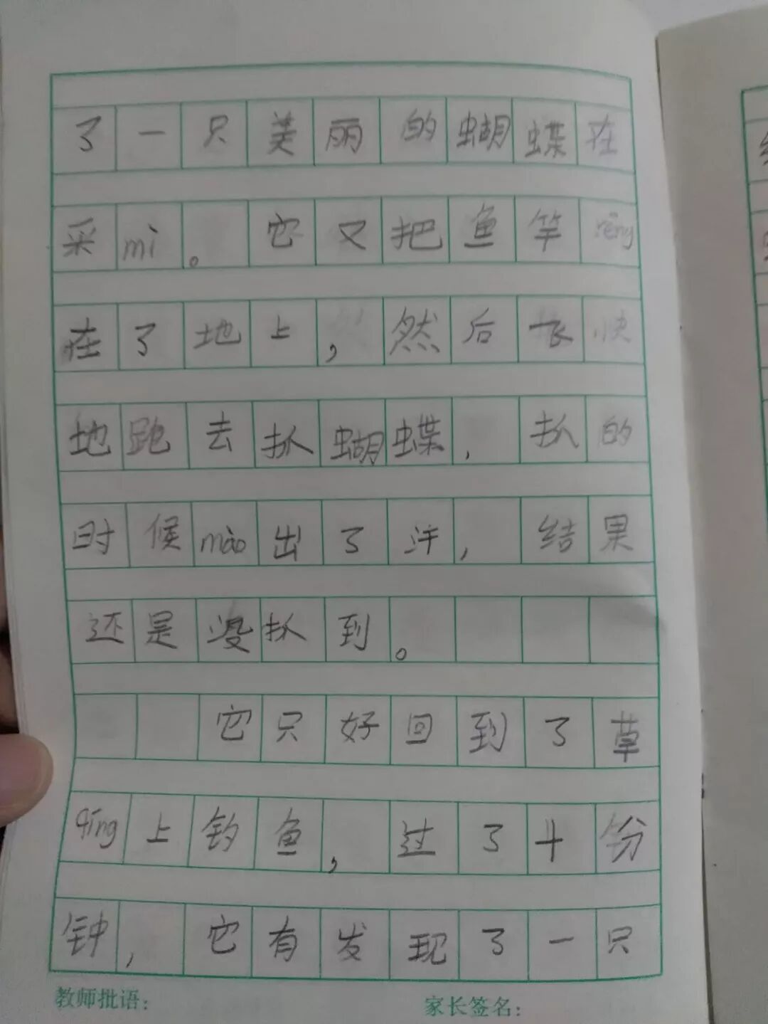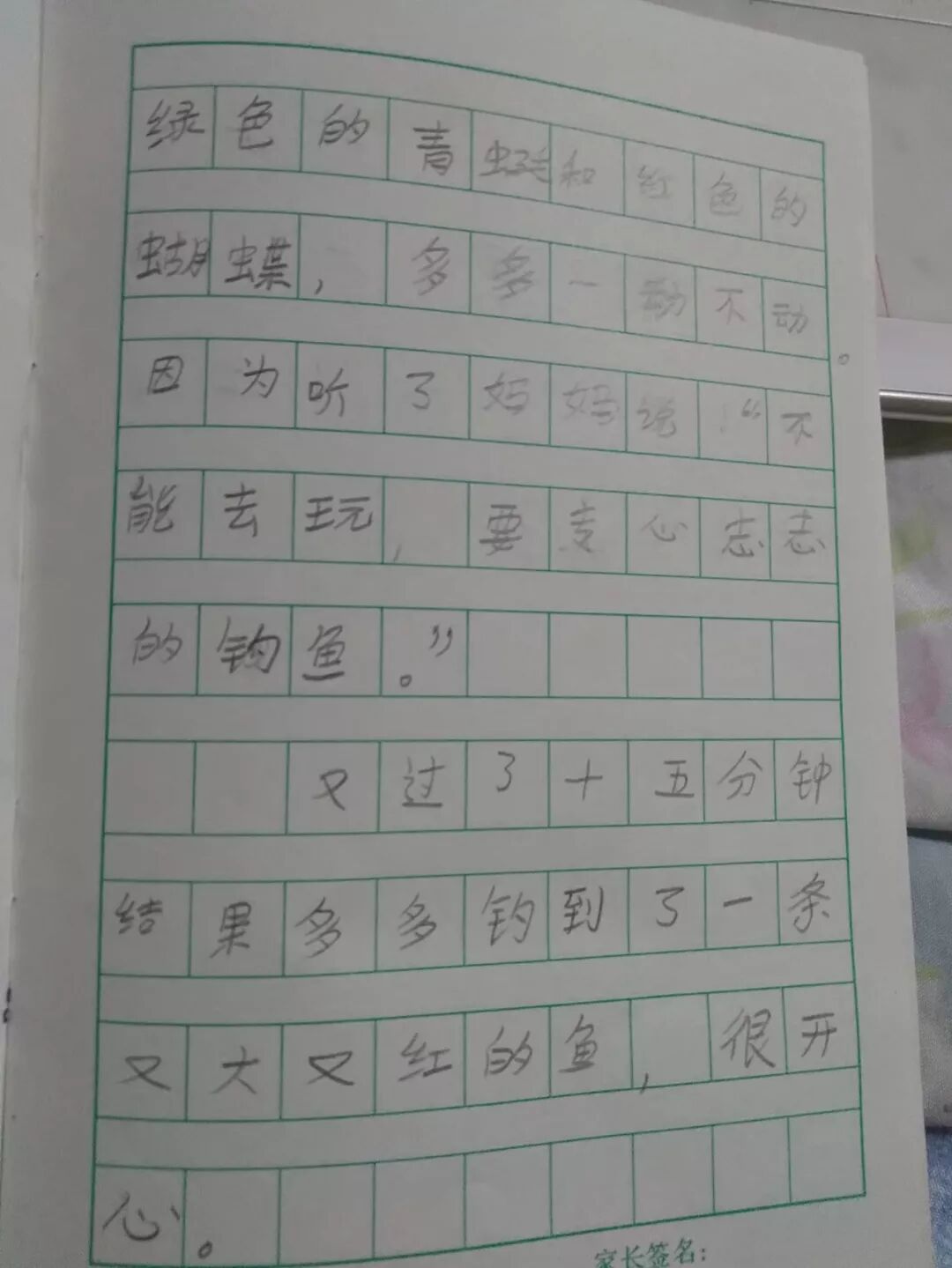 它只好回到了草坪上钓鱼,过了十分钟,它有发现了一只绿色的蜻蜓和红色的蝴蝶,多多一动不动。因为多多听了妈妈说:“不能去玩,要专心致志地钓鱼。”