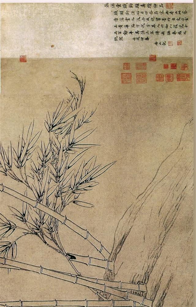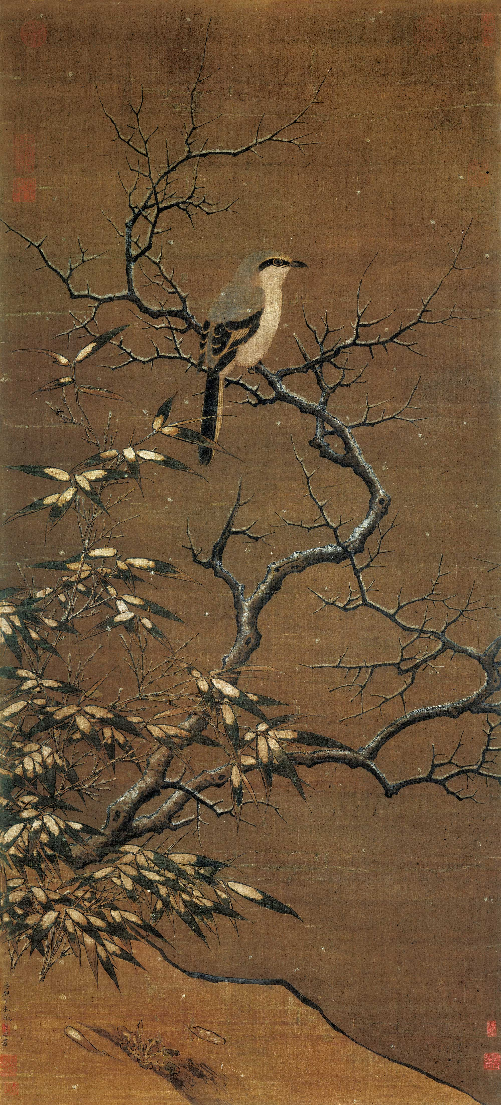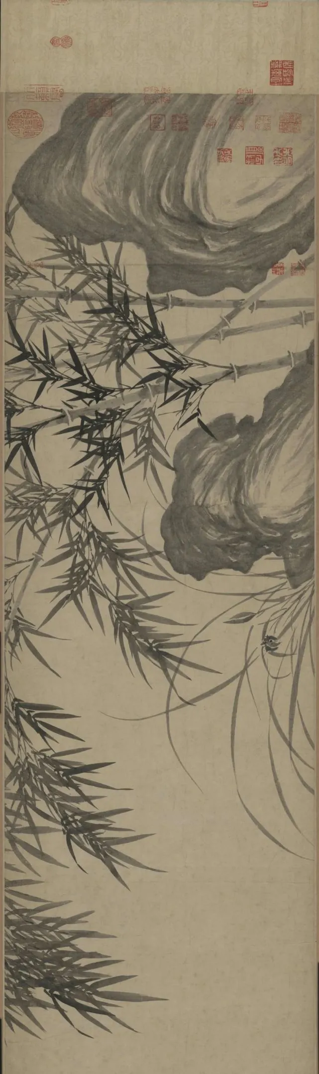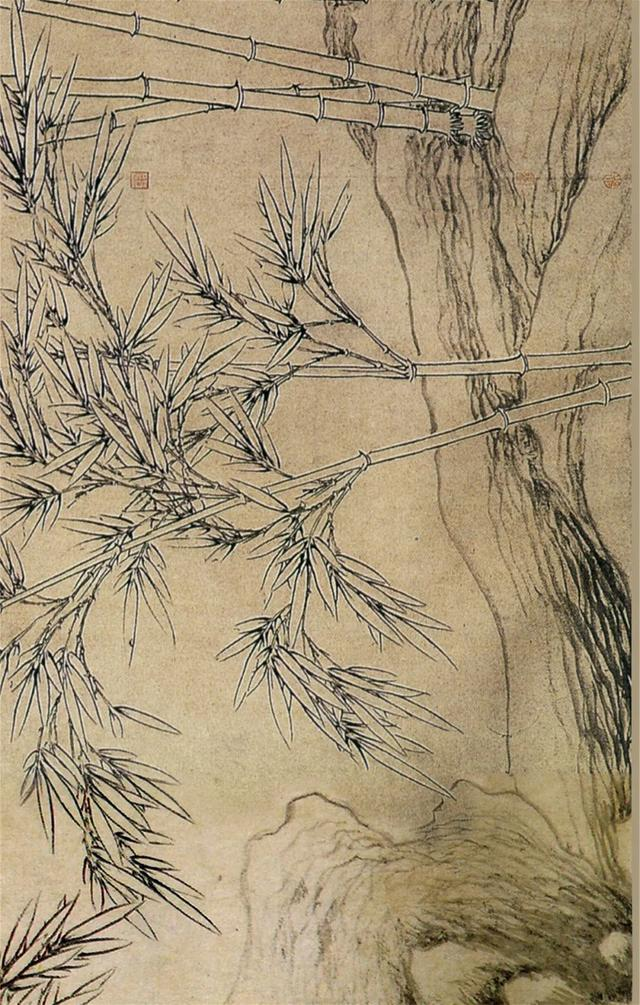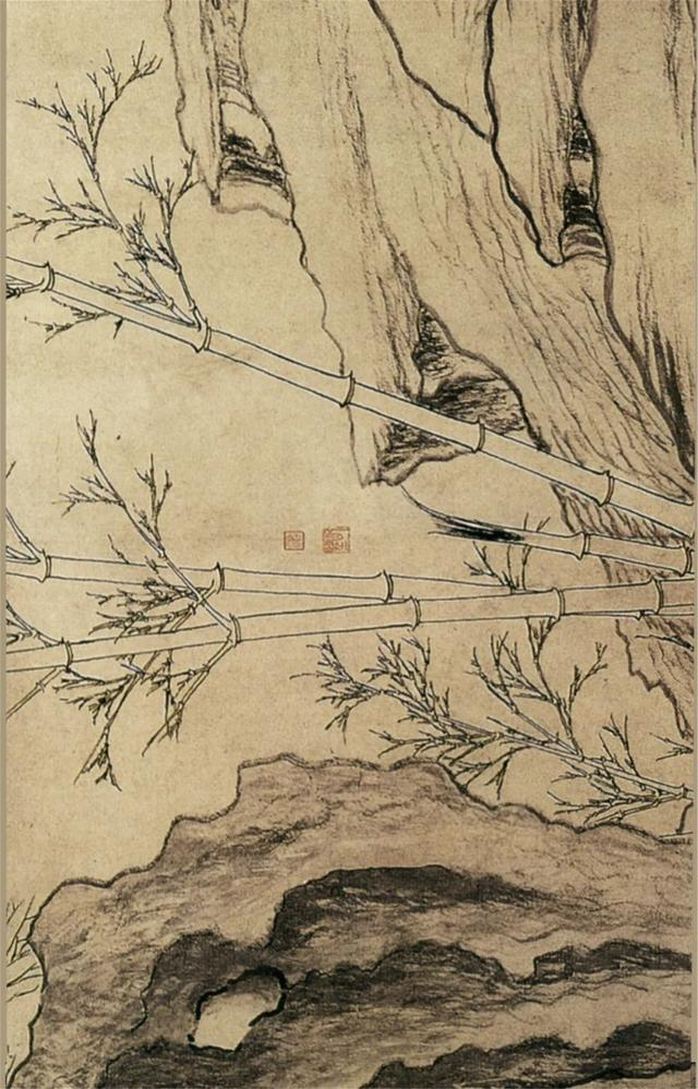 此卷描绘了竹林积雪的场景,画面中一林竹树在雪后高寒中拔地而起,坚韧挺拔,倾斜直上,竹竿枝叶姿态各异,在平静安逸中又不失动感。此图描绘生动写实,将粗笔、细笔结合勾勒竹竿枝叶,以浓淡不同的墨色表现雪后竹子的不同层次,细致工整而富有立体感,再现了雪后竹石的真实情态。所绘景物仅以水墨描绘,不施色彩,整体的写实画风与画史所载徐熙“以落墨为格”相符。——上海博物馆官网