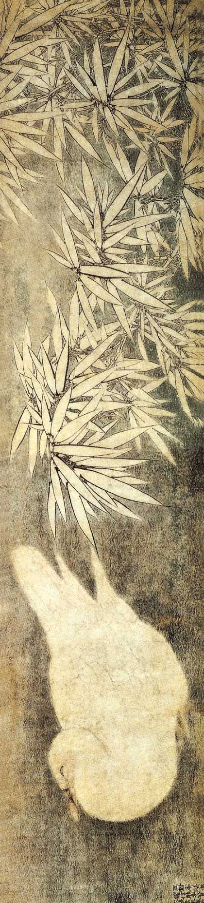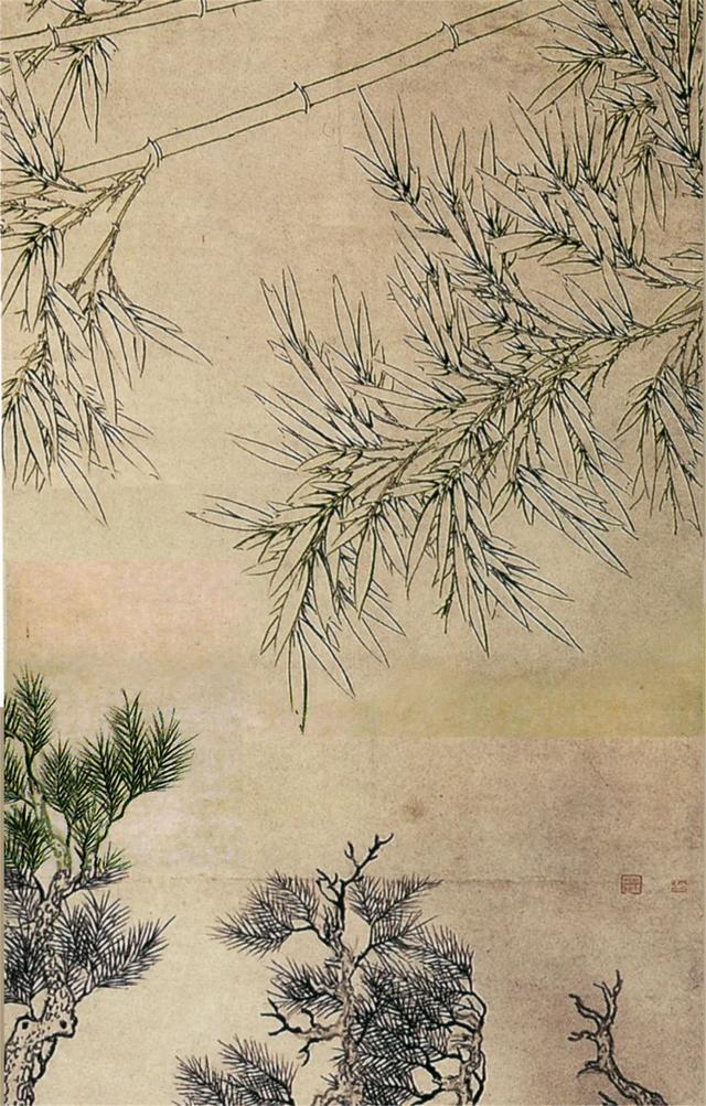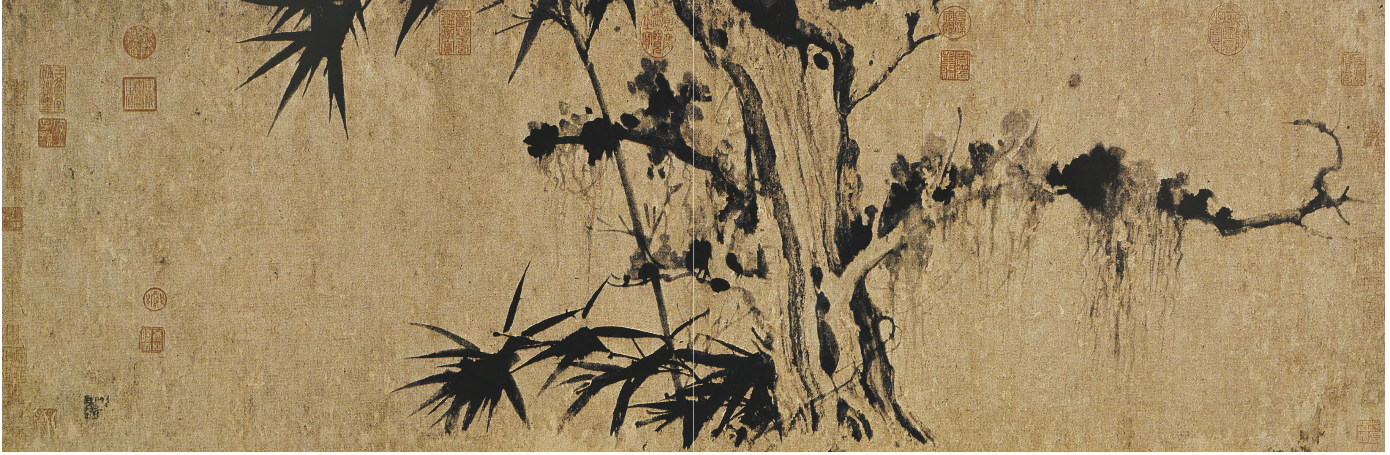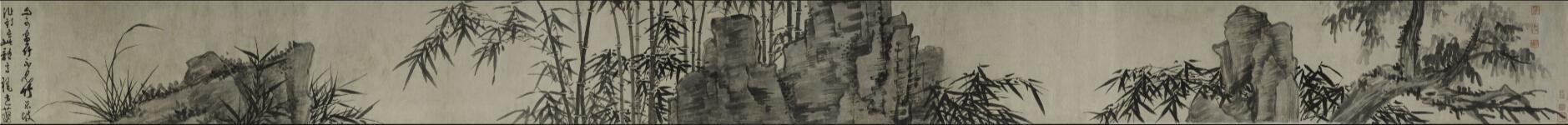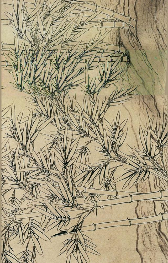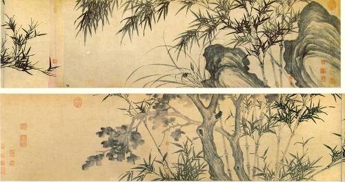 此卷描绘了竹林积雪的场景,画面中一林竹树在雪后高寒中拔地而起,坚韧挺拔,倾斜直上,竹竿枝叶姿态各异,在平静安逸中又不失动感。此图描绘生动写实,将粗笔、细笔结合勾勒竹竿枝叶,以浓淡不同的墨色表现雪后竹子的不同层次,细致工整而富有立体感,再现了雪后竹石的真实情态。所绘景物仅以水墨描绘,不施色彩,整体的写实画风与画史所载徐熙“以落墨为格”相符。——上海博物馆官网