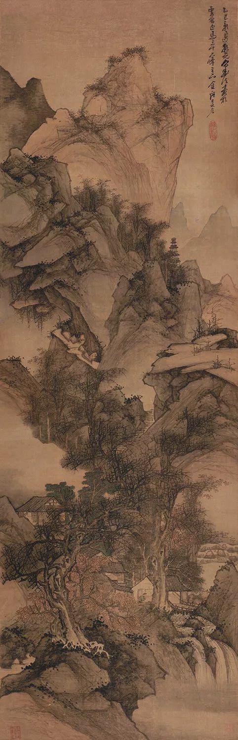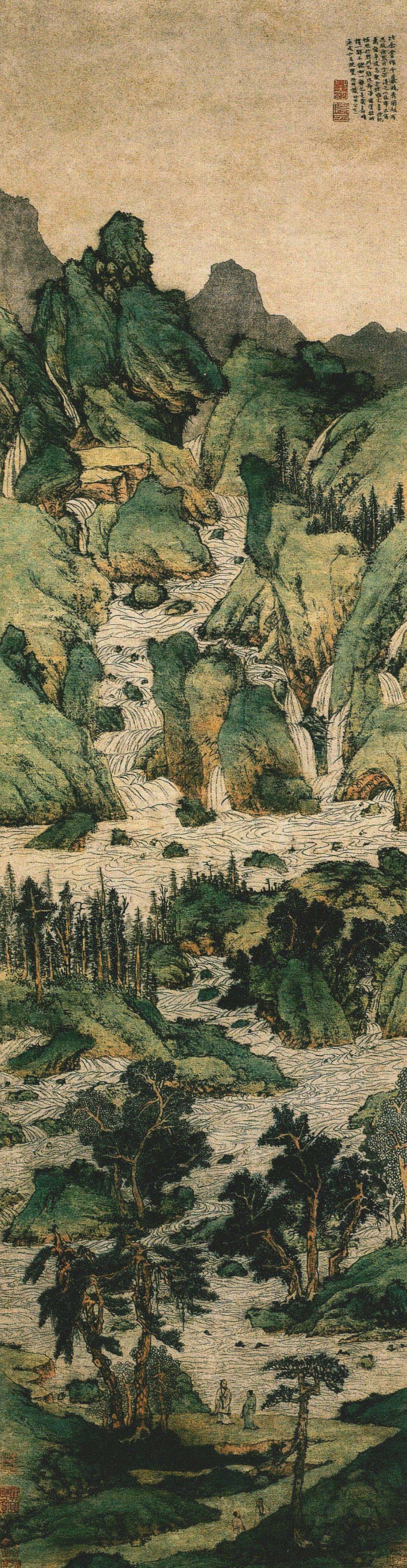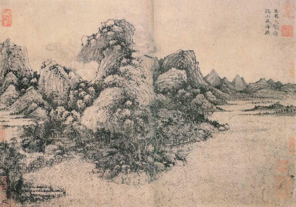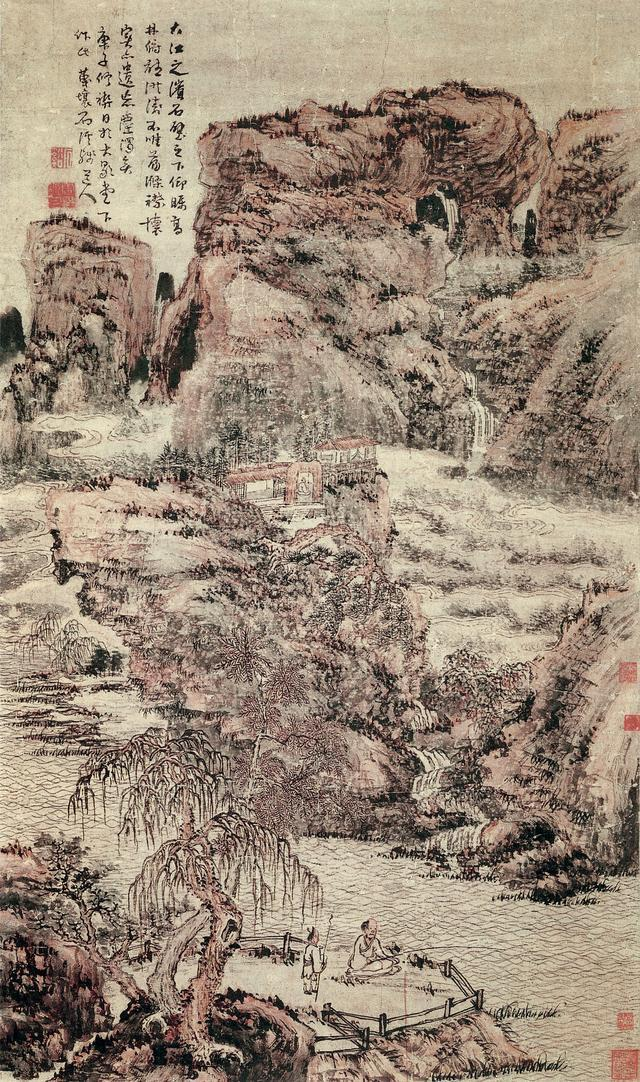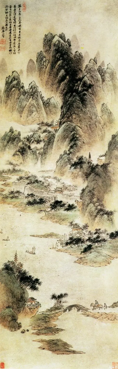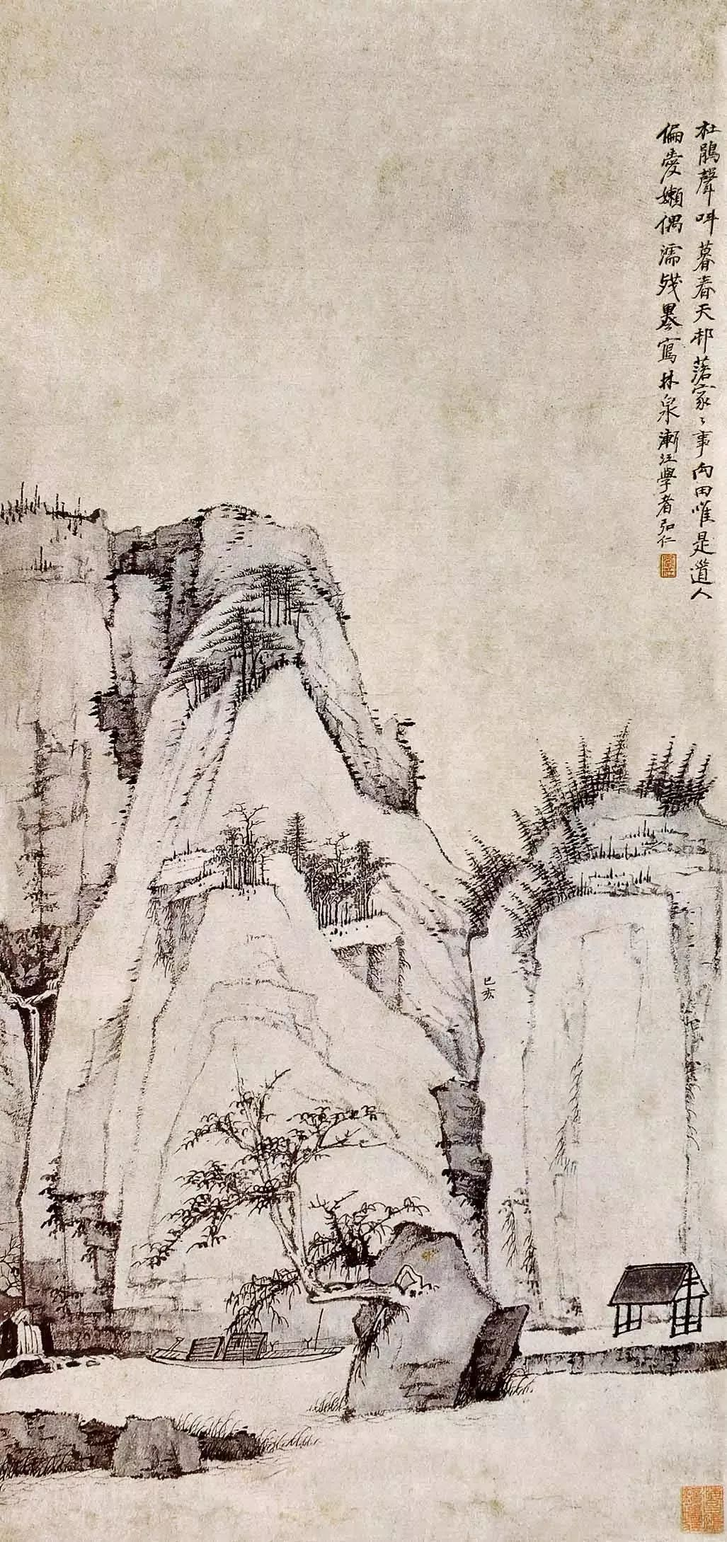 分疆三叠两段,似乎山水之失。然有不失之者,如自然分疆者,到江吴地尽,隔岸越山多是也。每每写山水如开辟分破,豪无生活,见之即知分疆。三叠者,一层地,二层树,三层山,望之何分远近,写此三叠奚翅印刻。两段者,景在下,山在上,俗以云在中,分明隔做两段。为此三者,先要贯通一气,不可拘泥分疆。三叠两段,偏要突手作用,才见笔力。即入千峰万壑,俱无俗迹。为此三者入神,则于细碎有失,亦不碍矣——石涛《苦瓜和尚画语录》境界章第十·