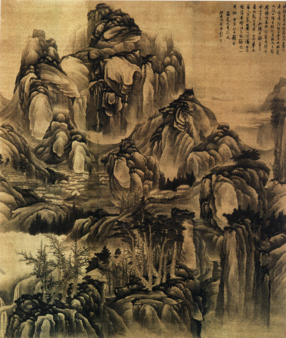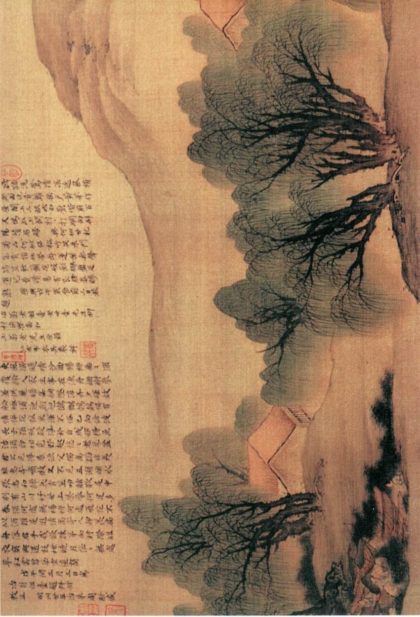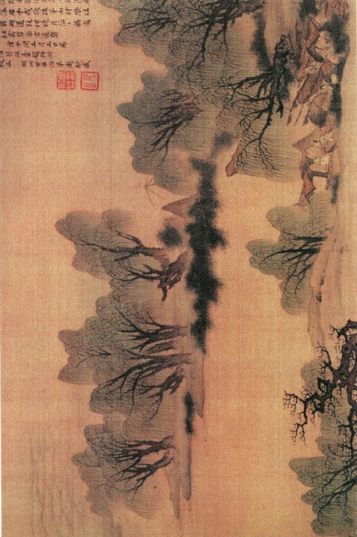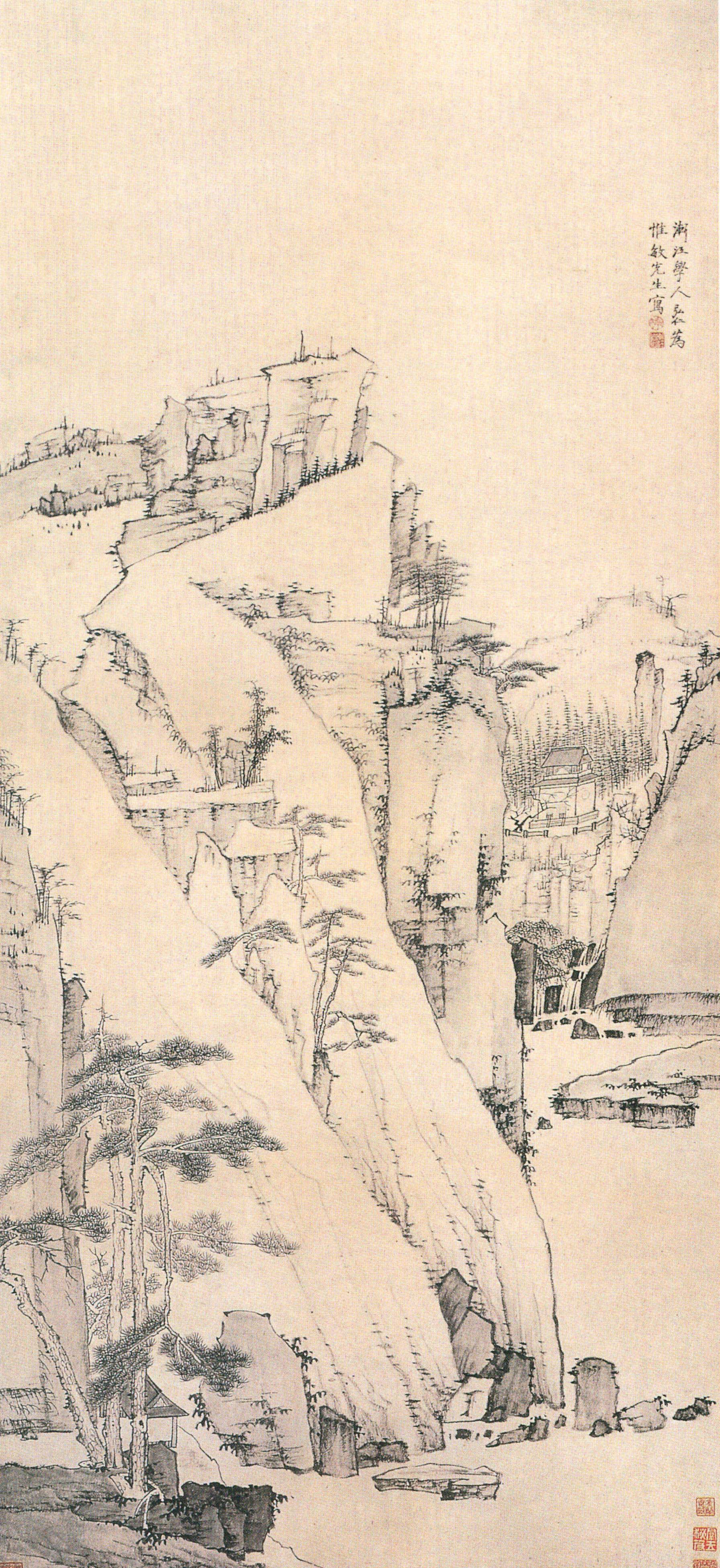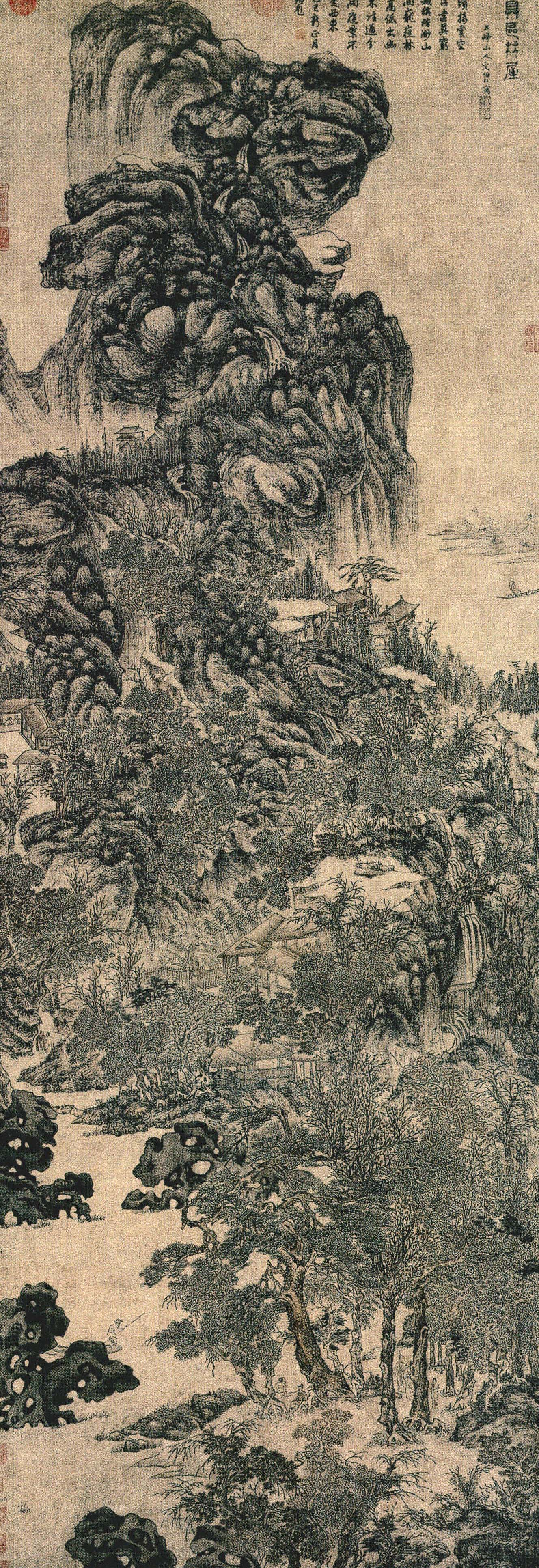 分疆三叠两段,似乎山水之失。然有不失之者,如自然分疆者,到江吴地尽,隔岸越山多是也。每每写山水如开辟分破,豪无生活,见之即知分疆。三叠者,一层地,二层树,三层山,望之何分远近,写此三叠奚翅印刻。两段者,景在下,山在上,俗以云在中,分明隔做两段。为此三者,先要贯通一气,不可拘泥分疆。三叠两段,偏要突手作用,才见笔力。即入千峰万壑,俱无俗迹。为此三者入神,则于细碎有失,亦不碍矣——石涛《苦瓜和尚画语录》境界章第十·