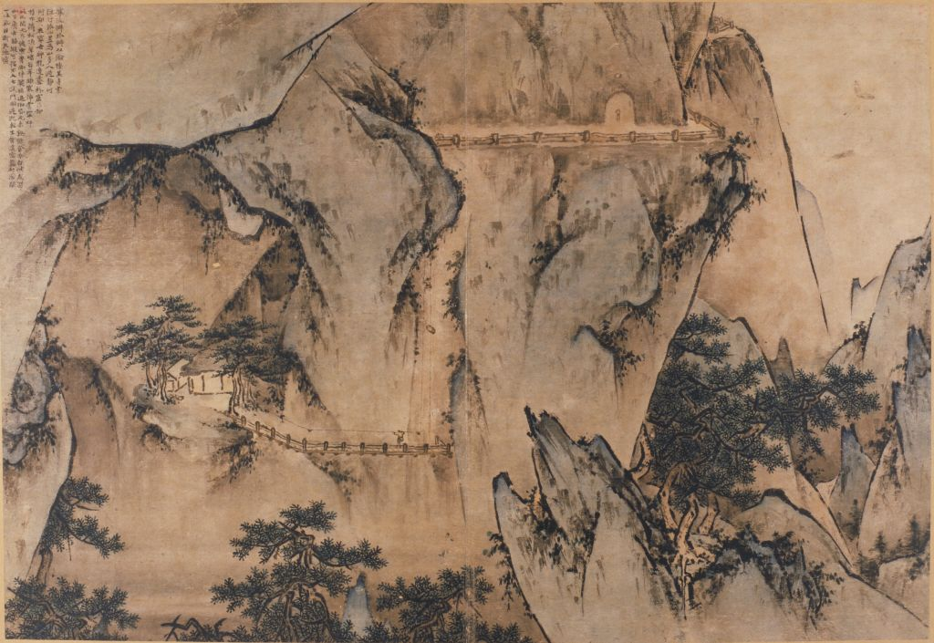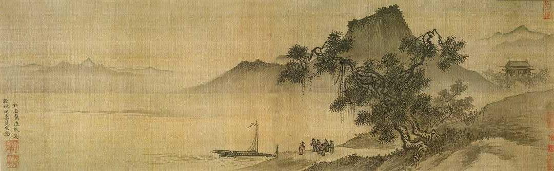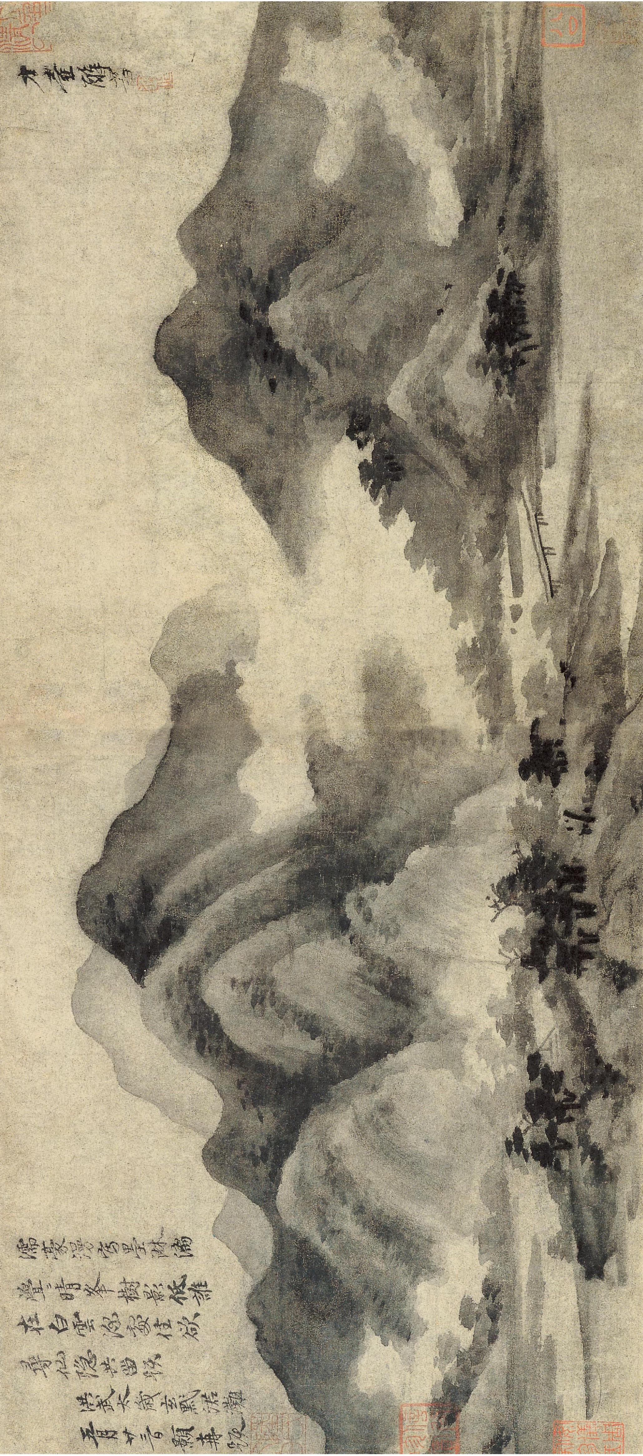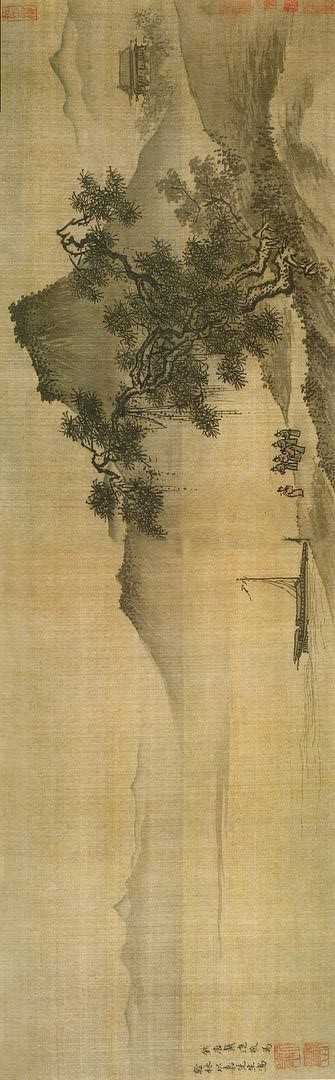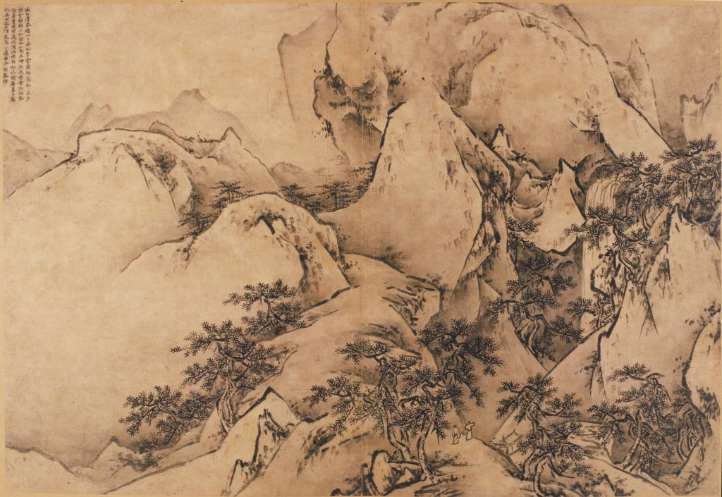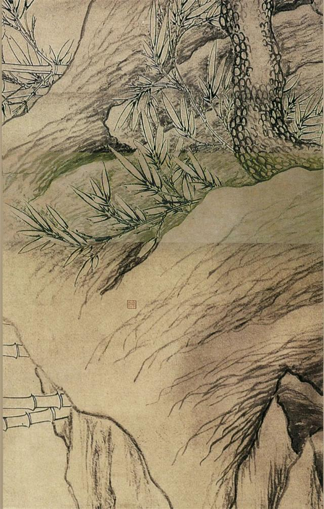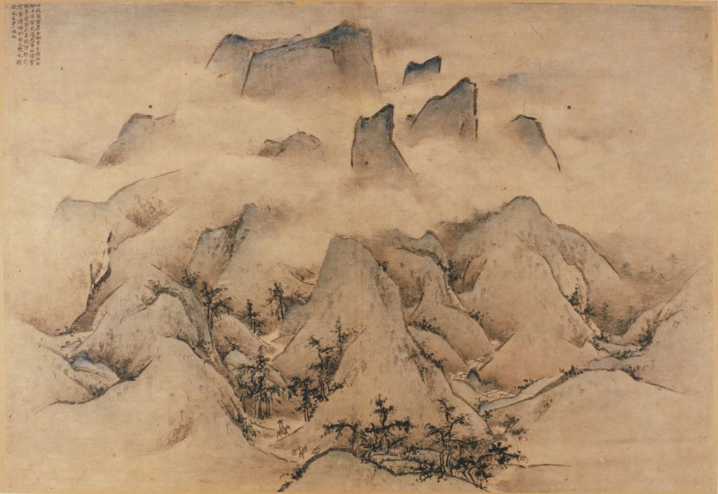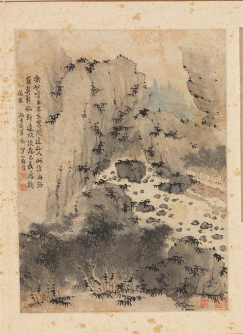 分疆三叠两段,似乎山水之失。然有不失之者,如自然分疆者,到江吴地尽,隔岸越山多是也。每每写山水如开辟分破,豪无生活,见之即知分疆。三叠者,一层地,二层树,三层山,望之何分远近,写此三叠奚翅印刻。两段者,景在下,山在上,俗以云在中,分明隔做两段。为此三者,先要贯通一气,不可拘泥分疆。三叠两段,偏要突手作用,才见笔力。即入千峰万壑,俱无俗迹。为此三者入神,则于细碎有失,亦不碍矣——石涛《苦瓜和尚画语录》境界章第十·