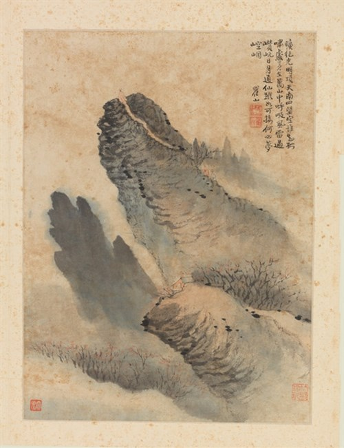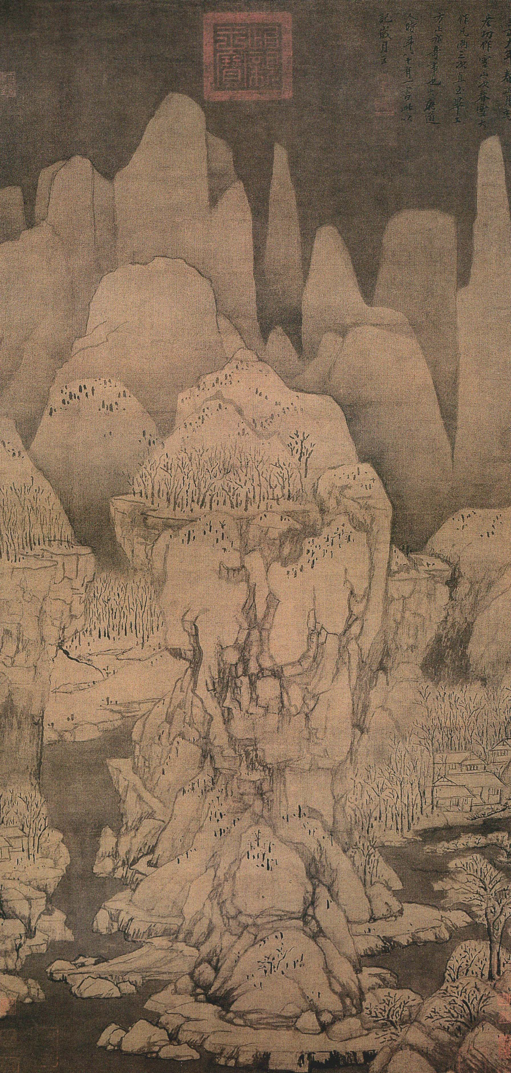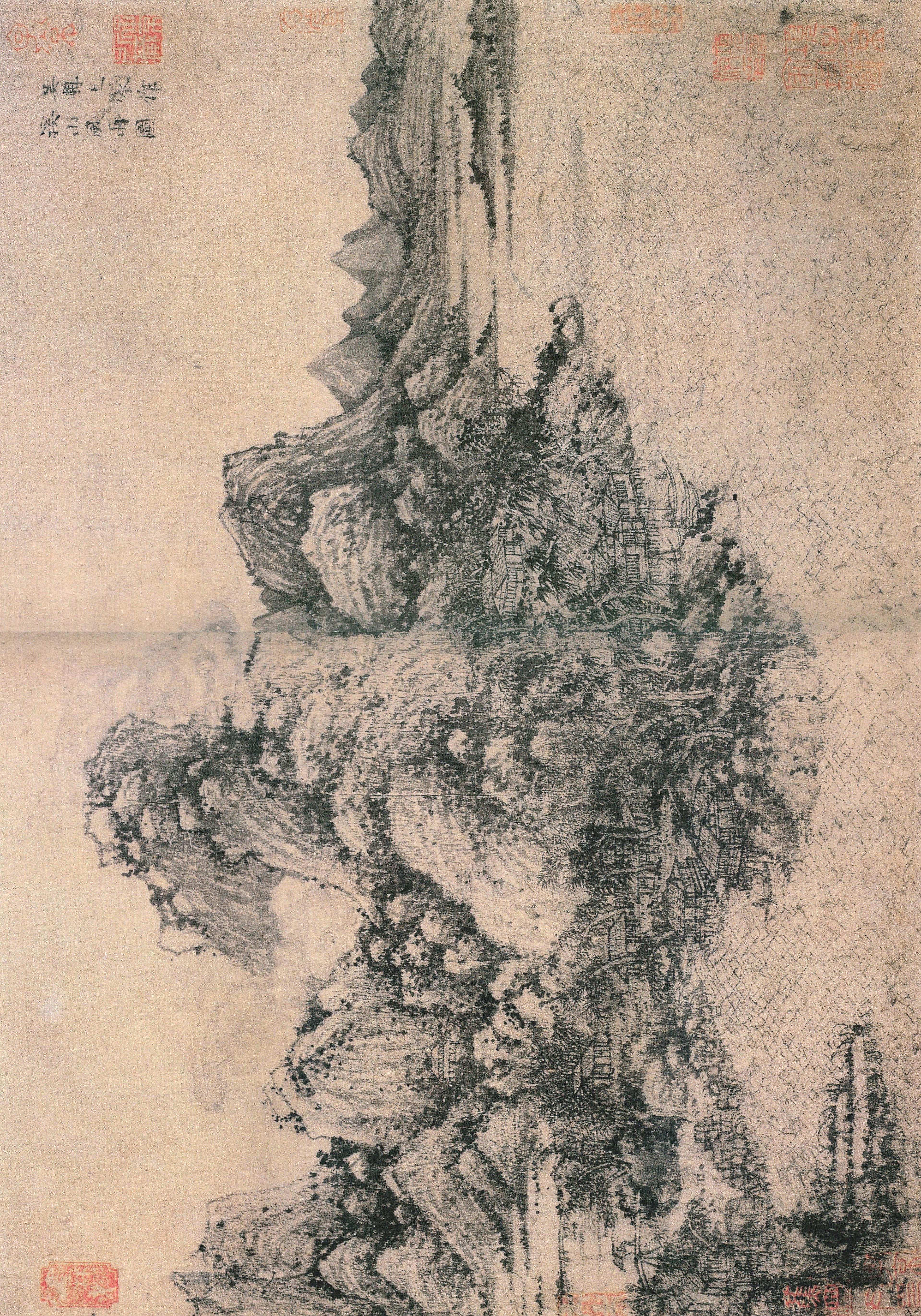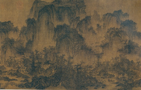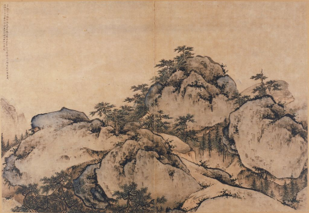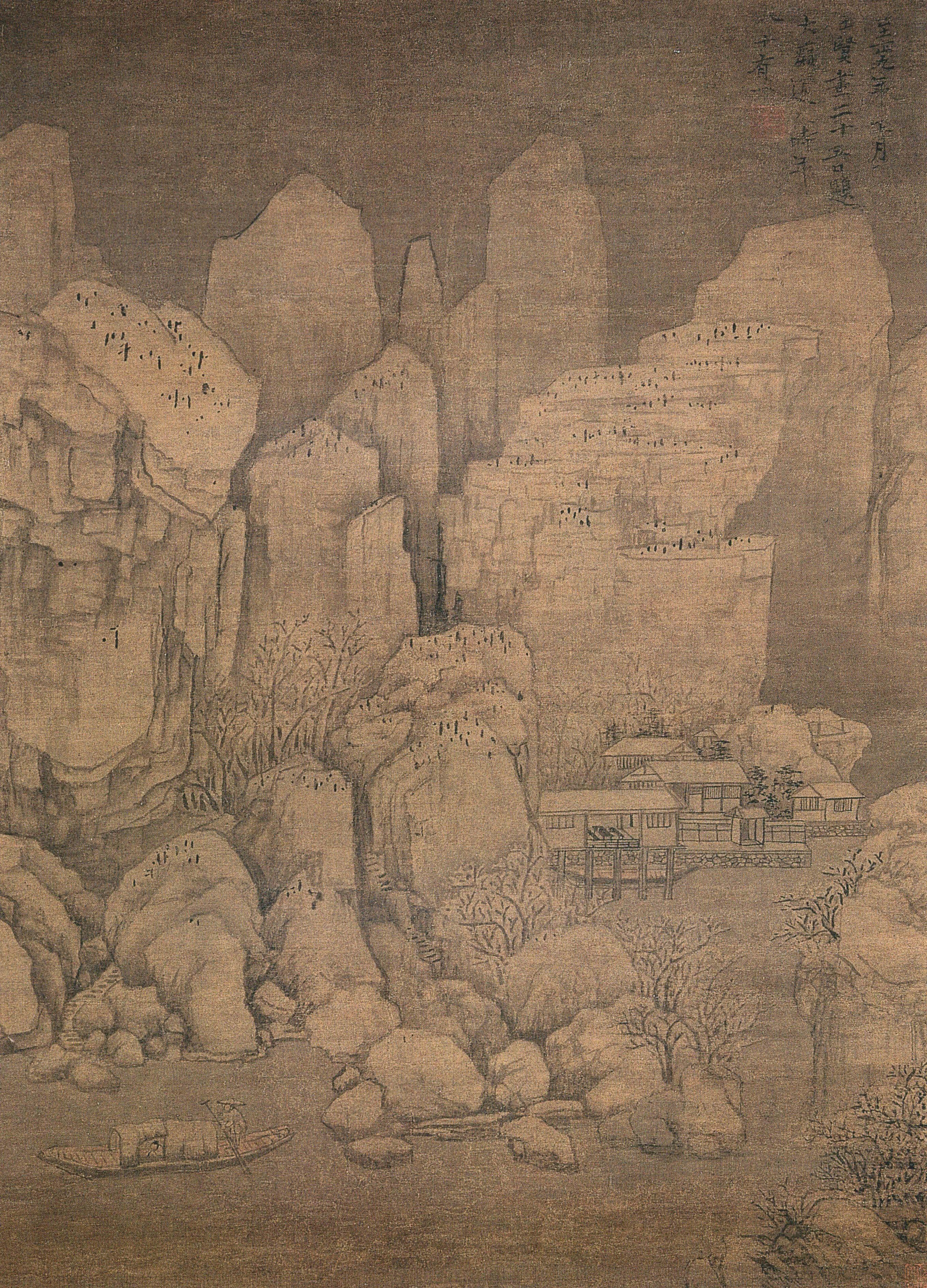 分疆三叠两段,似乎山水之失。然有不失之者,如自然分疆者,到江吴地尽,隔岸越山多是也。每每写山水如开辟分破,豪无生活,见之即知分疆。三叠者,一层地,二层树,三层山,望之何分远近,写此三叠奚翅印刻。两段者,景在下,山在上,俗以云在中,分明隔做两段。为此三者,先要贯通一气,不可拘泥分疆。三叠两段,偏要突手作用,才见笔力。即入千峰万壑,俱无俗迹。为此三者入神,则于细碎有失,亦不碍矣——石涛《苦瓜和尚画语录》境界章第十·