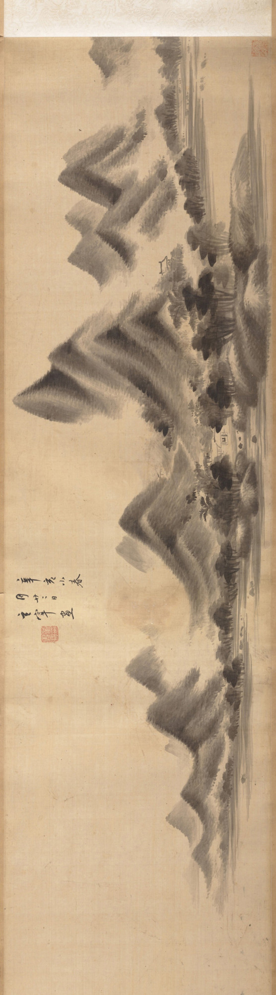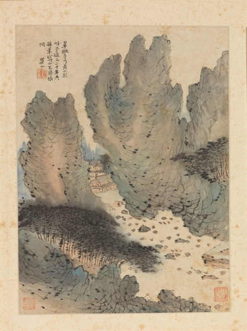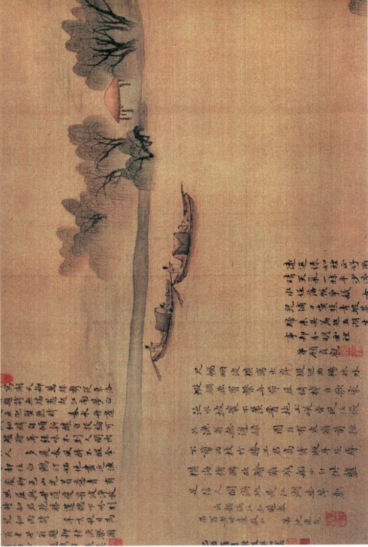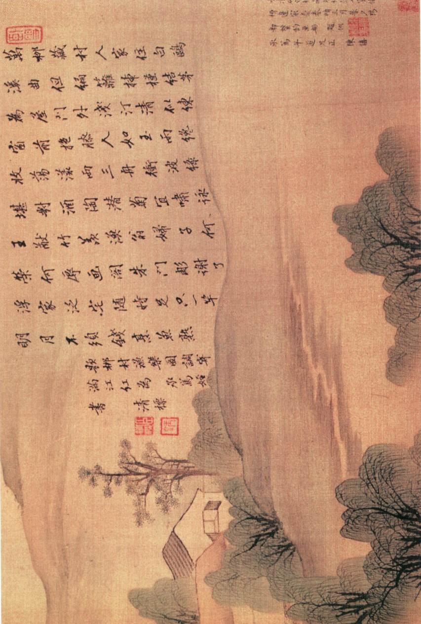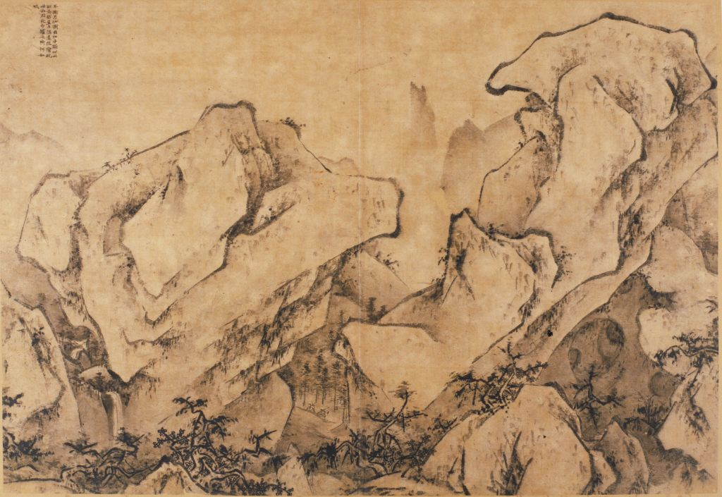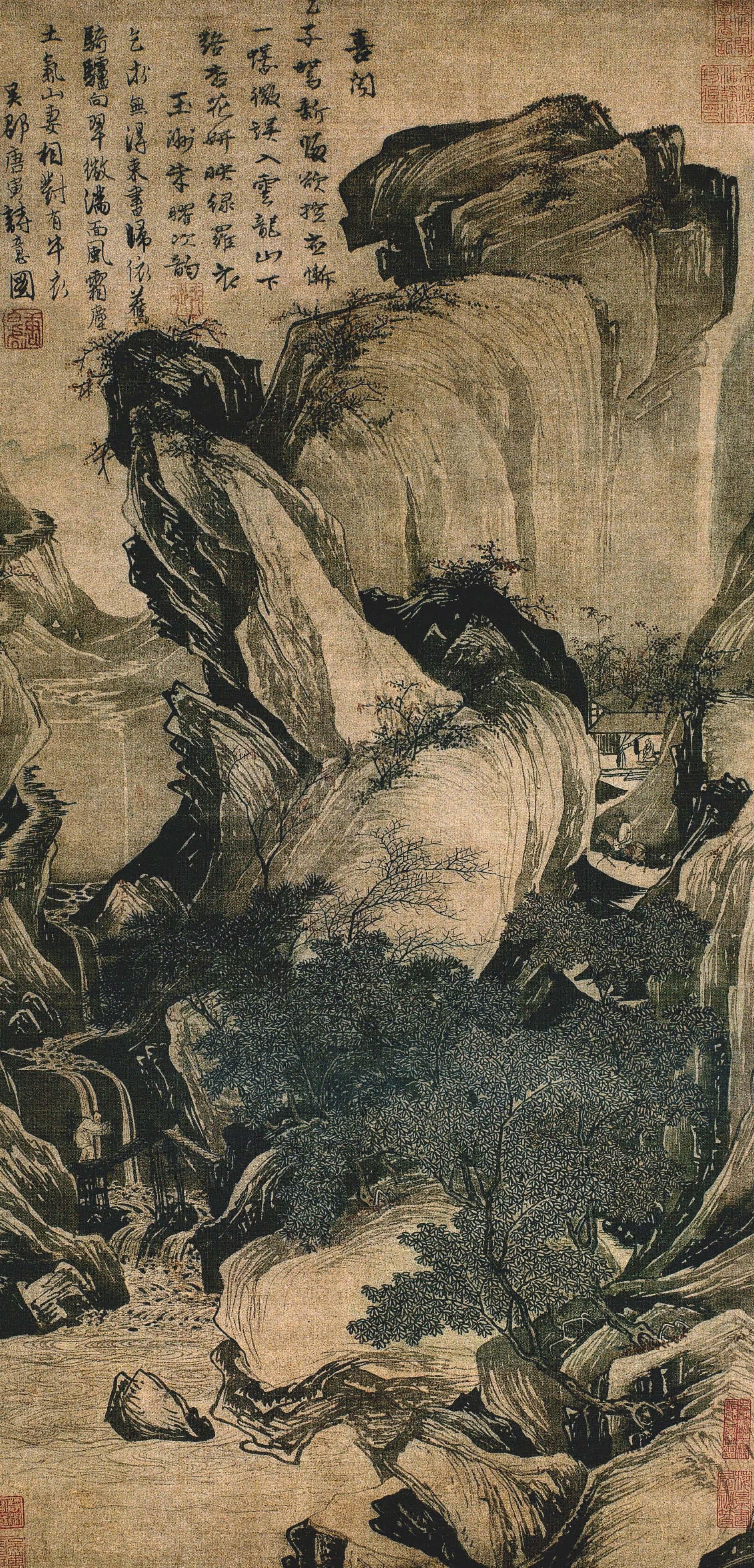 分疆三叠两段,似乎山水之失。然有不失之者,如自然分疆者,到江吴地尽,隔岸越山多是也。每每写山水如开辟分破,豪无生活,见之即知分疆。三叠者,一层地,二层树,三层山,望之何分远近,写此三叠奚翅印刻。两段者,景在下,山在上,俗以云在中,分明隔做两段。为此三者,先要贯通一气,不可拘泥分疆。三叠两段,偏要突手作用,才见笔力。即入千峰万壑,俱无俗迹。为此三者入神,则于细碎有失,亦不碍矣——石涛《苦瓜和尚画语录》境界章第十·