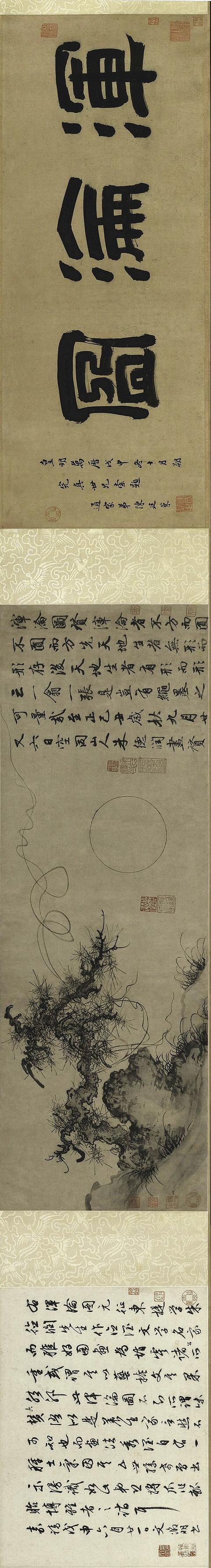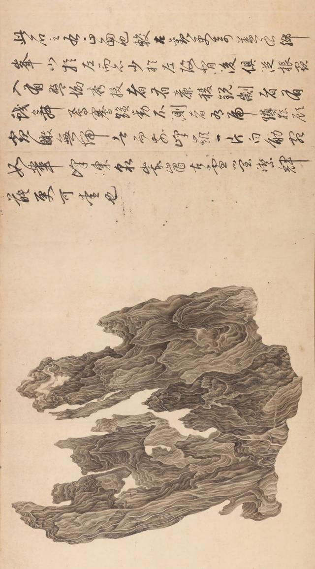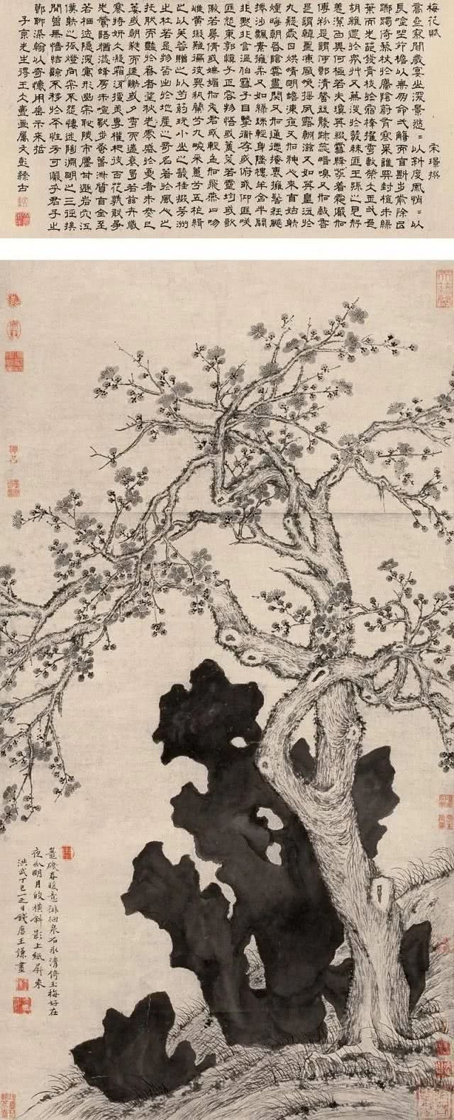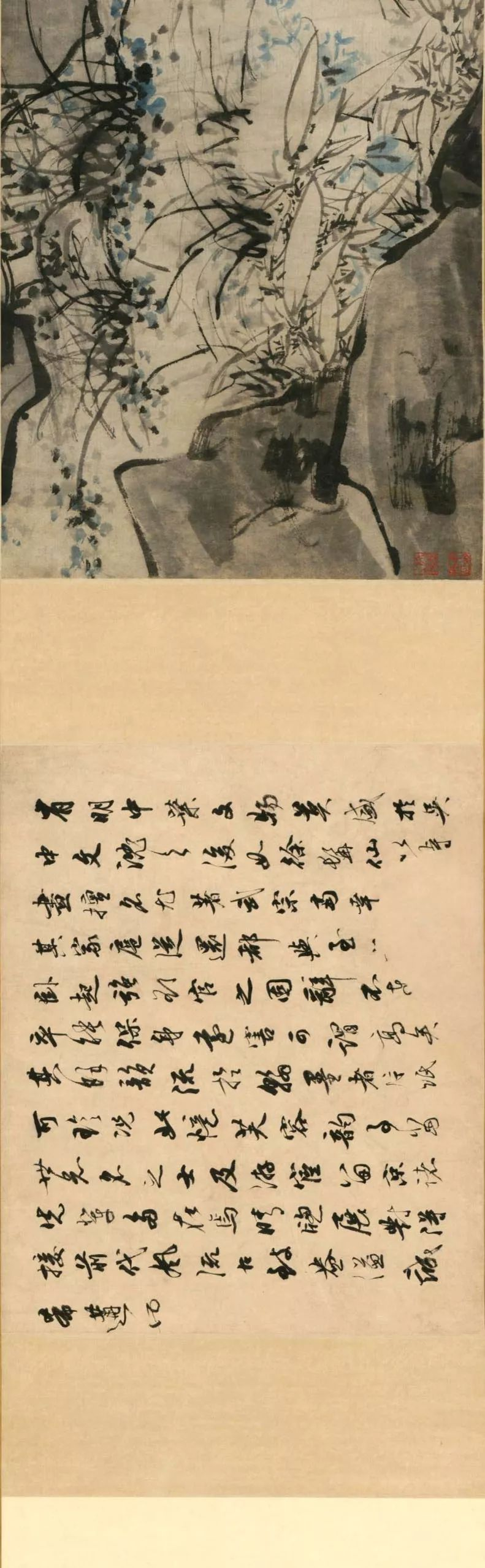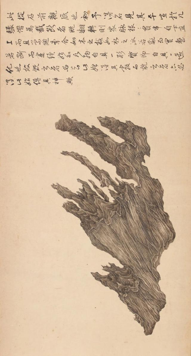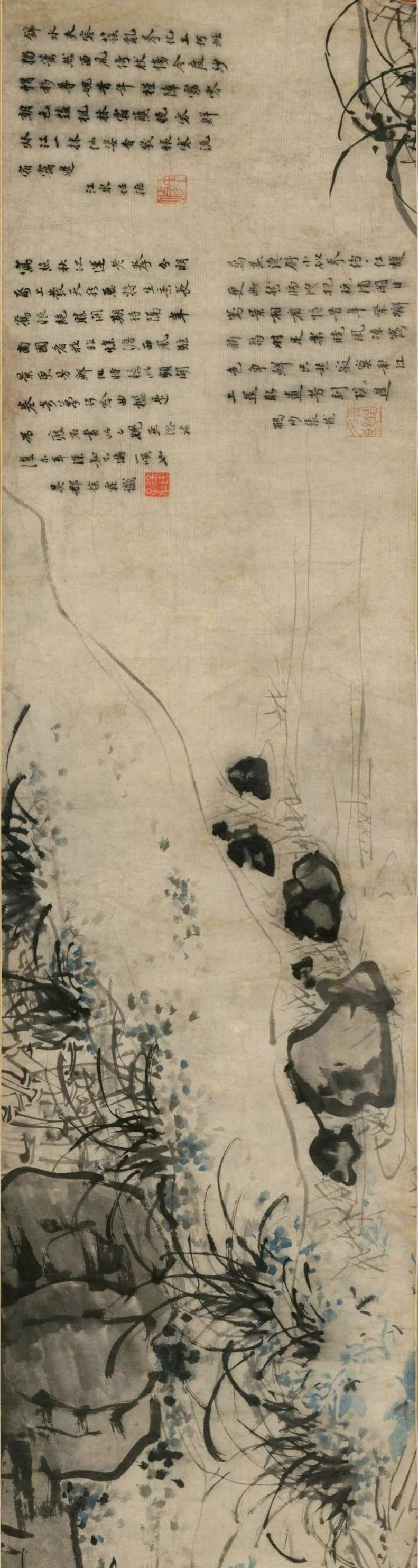 这幅画网上都说在天津博物馆,但我在官方查仅有一篇2018年的文章引用了这幅画,但也没有明确说明这幅画是他们的馆藏,故存疑,金农最开始吸引我的是他的书法,早年习汉隶,晚年开始变法,扁笔作隶书,横方粗、竖细劲,称之为漆书(这幅画里的字不是漆书哈),该画线条粗莽拙朴、顿挫有律,这幅画用作让大家理解什么是“金石气”是最好不过的了,金石是指金属与石板上雕凿而成的文字,这样的文字线条多是刚硬、拙劲、生涩、古朴的姿态,从而演化出了异于“纸帖”的“石碑”式审美,而这幅作品中的金石气,不仅仅体现在了书法上,更是表现在了绘画的笔墨线条拙朴之中,金农本身酷爱金石,这幅作品字金石、画金石,题记后半段聊的也是书法,不愧为金吉金(但注意“金石气”不能完全等同于“金石线条入画”);
