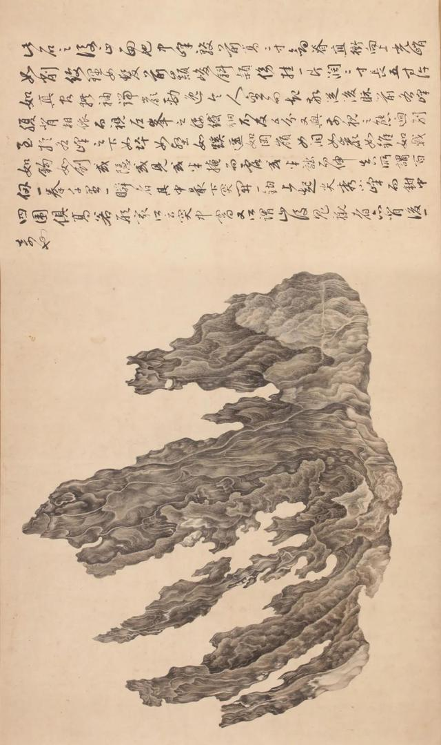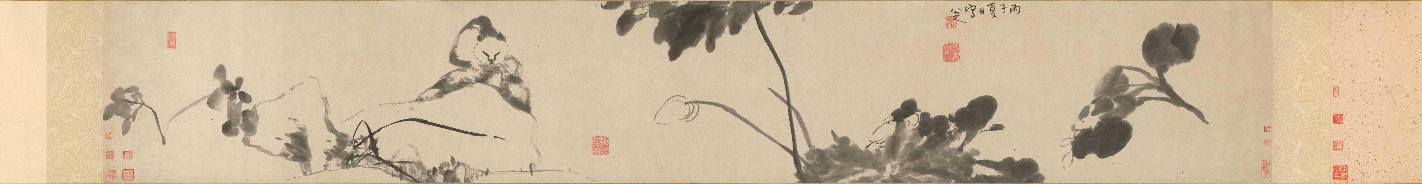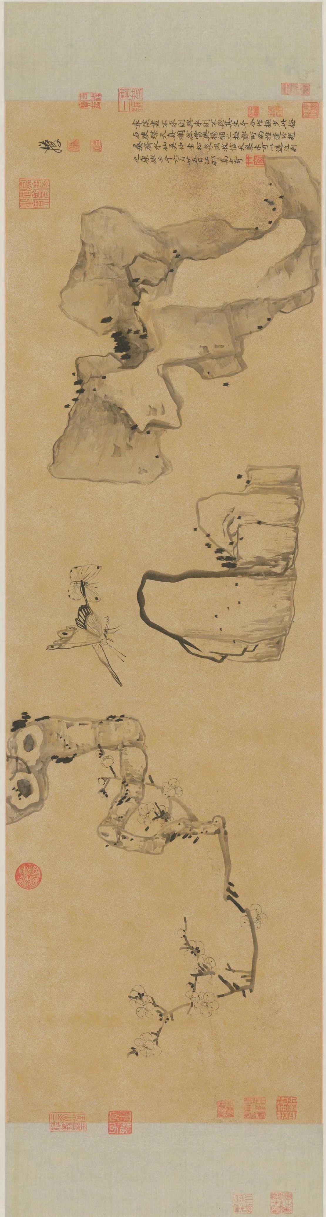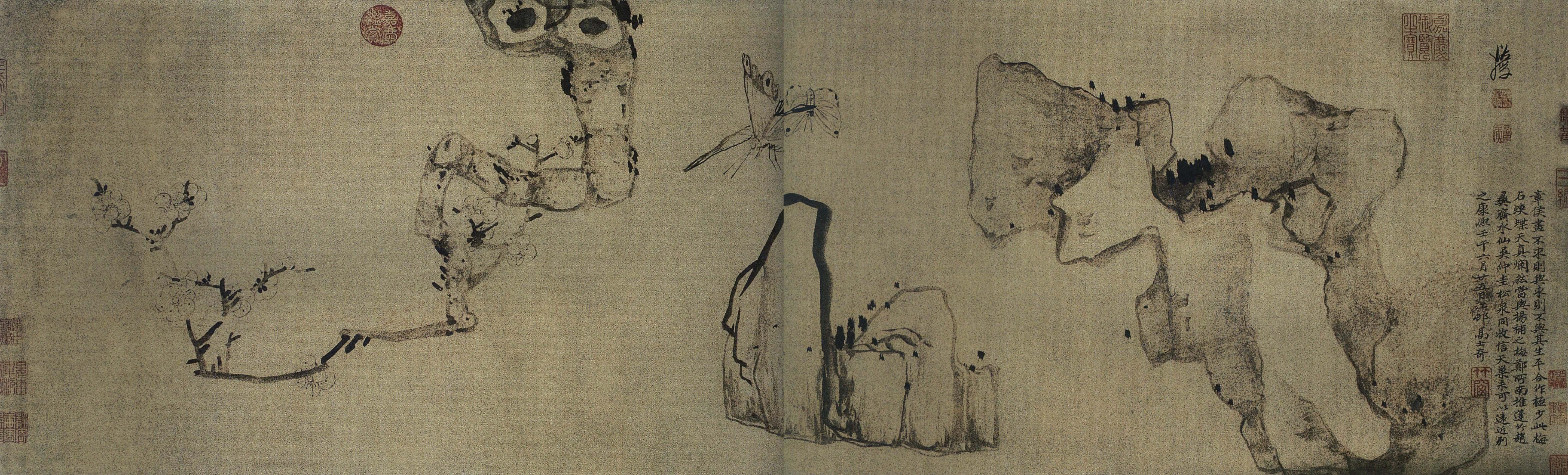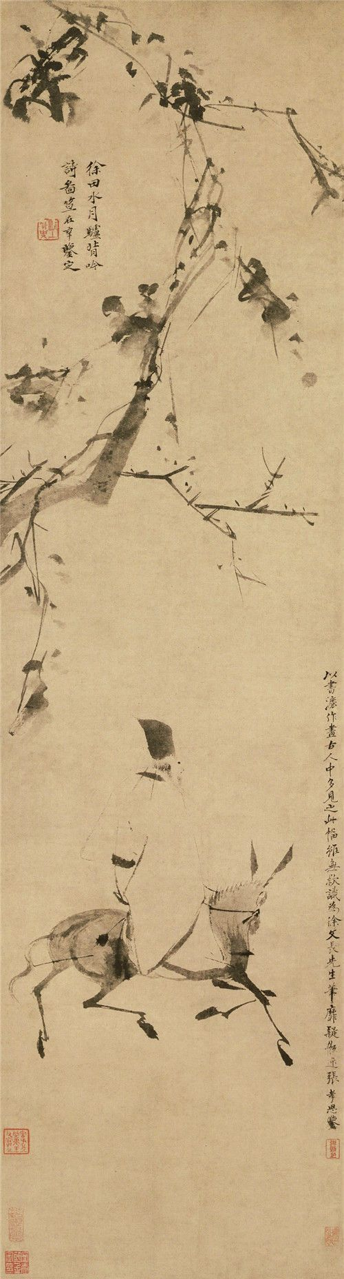 这幅画网上都说在天津博物馆,但我在官方查仅有一篇2018年的文章引用了这幅画,但也没有明确说明这幅画是他们的馆藏,故存疑,金农最开始吸引我的是他的书法,早年习汉隶,晚年开始变法,扁笔作隶书,横方粗、竖细劲,称之为漆书(这幅画里的字不是漆书哈),该画线条粗莽拙朴、顿挫有律,这幅画用作让大家理解什么是“金石气”是最好不过的了,金石是指金属与石板上雕凿而成的文字,这样的文字线条多是刚硬、拙劲、生涩、古朴的姿态,从而演化出了异于“纸帖”的“石碑”式审美,而这幅作品中的金石气,不仅仅体现在了书法上,更是表现在了绘画的笔墨线条拙朴之中,金农本身酷爱金石,这幅作品字金石、画金石,题记后半段聊的也是书法,不愧为金吉金(但注意“金石气”不能完全等同于“金石线条入画”);