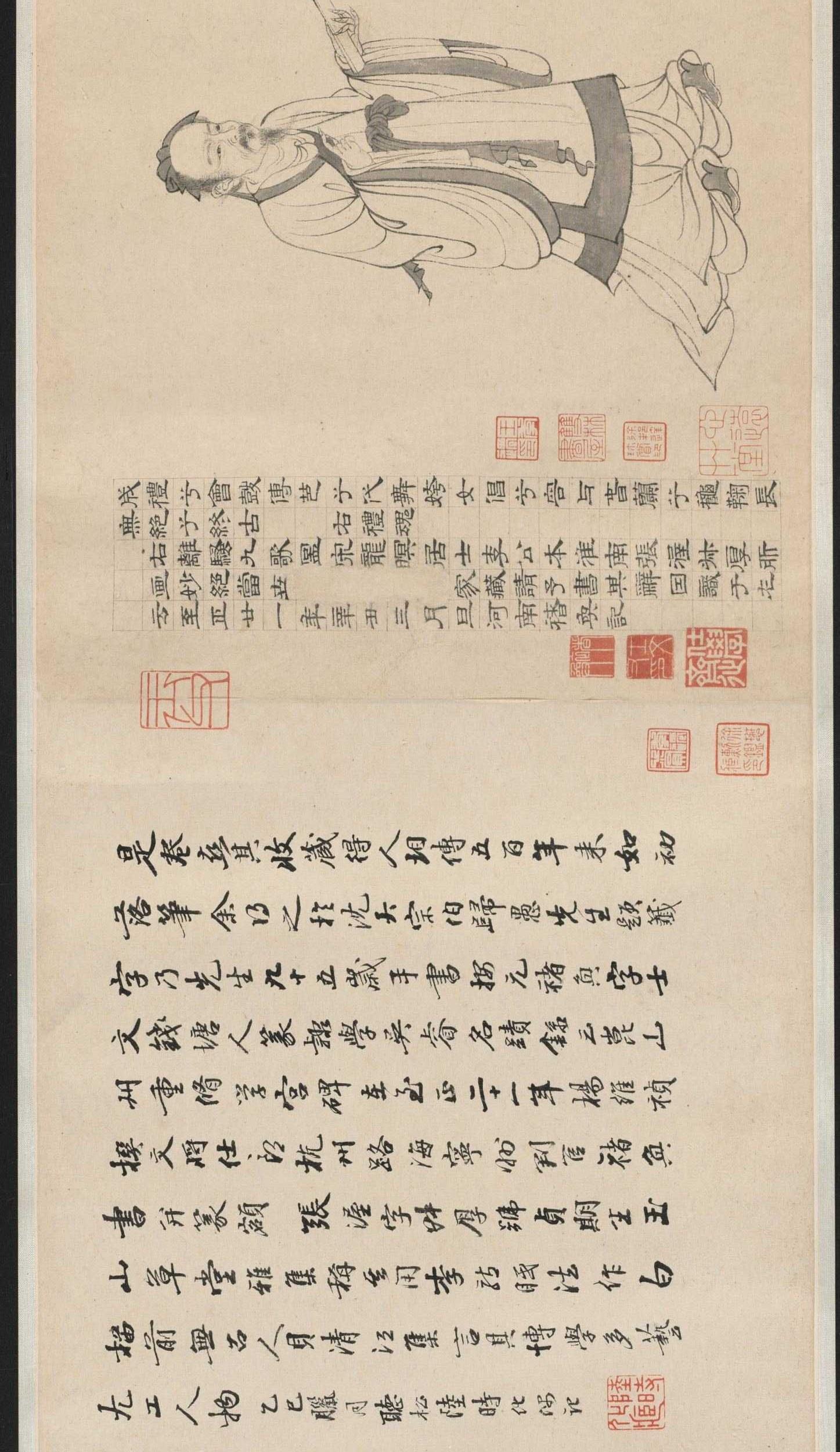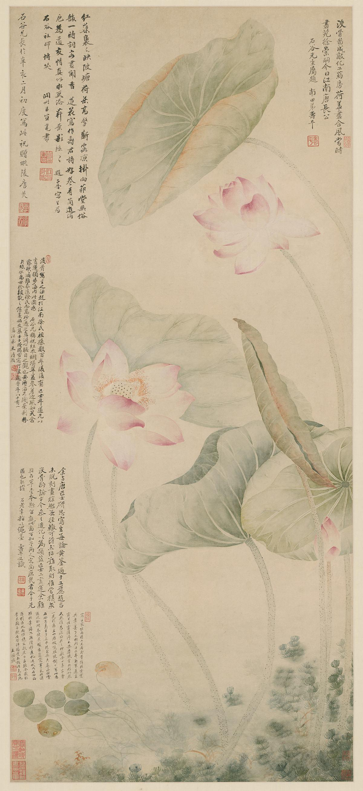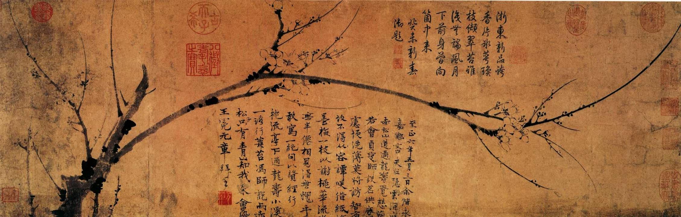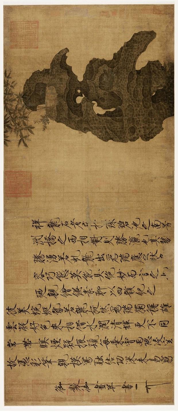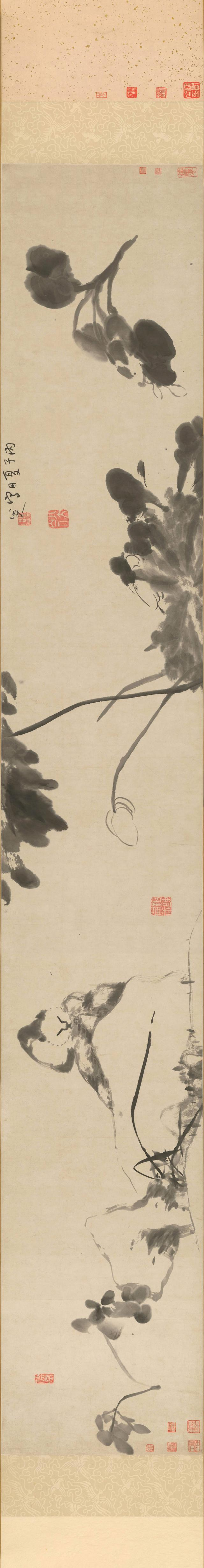 这幅画网上都说在天津博物馆,但我在官方查仅有一篇2018年的文章引用了这幅画,但也没有明确说明这幅画是他们的馆藏,故存疑,金农最开始吸引我的是他的书法,早年习汉隶,晚年开始变法,扁笔作隶书,横方粗、竖细劲,称之为漆书(这幅画里的字不是漆书哈),该画线条粗莽拙朴、顿挫有律,这幅画用作让大家理解什么是“金石气”是最好不过的了,金石是指金属与石板上雕凿而成的文字,这样的文字线条多是刚硬、拙劲、生涩、古朴的姿态,从而演化出了异于“纸帖”的“石碑”式审美,而这幅作品中的金石气,不仅仅体现在了书法上,更是表现在了绘画的笔墨线条拙朴之中,金农本身酷爱金石,这幅作品字金石、画金石,题记后半段聊的也是书法,不愧为金吉金(但注意“金石气”不能完全等同于“金石线条入画”);