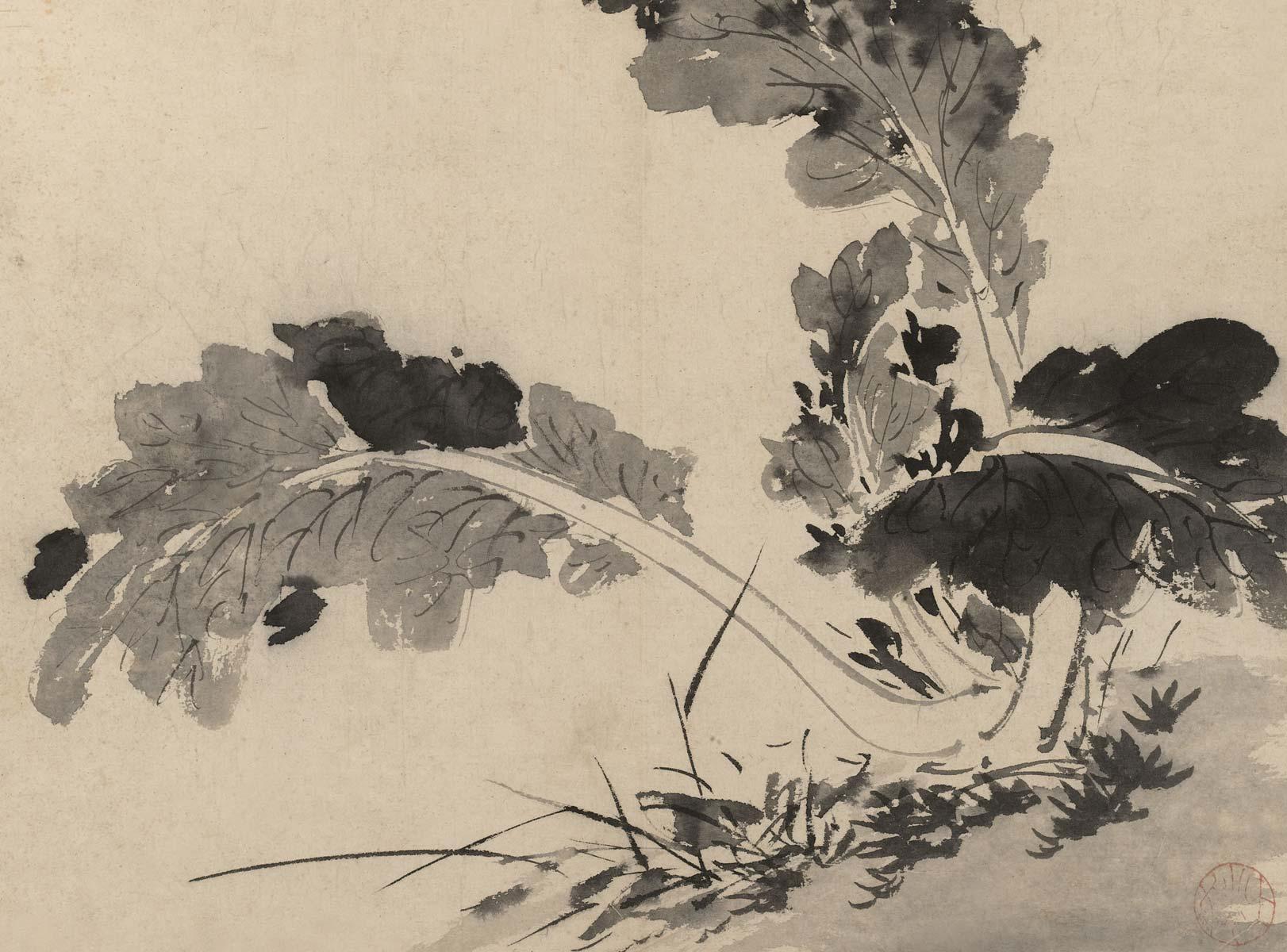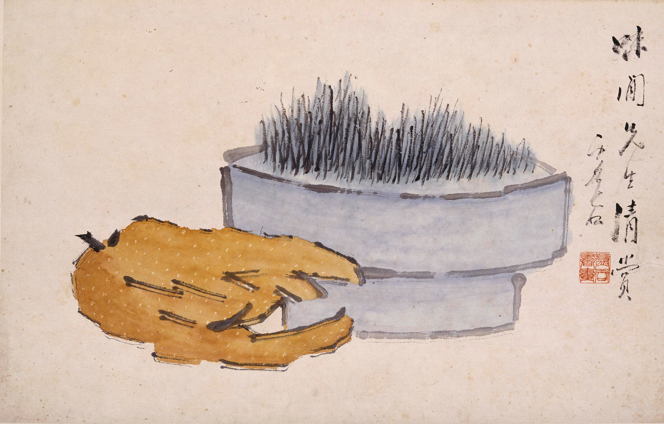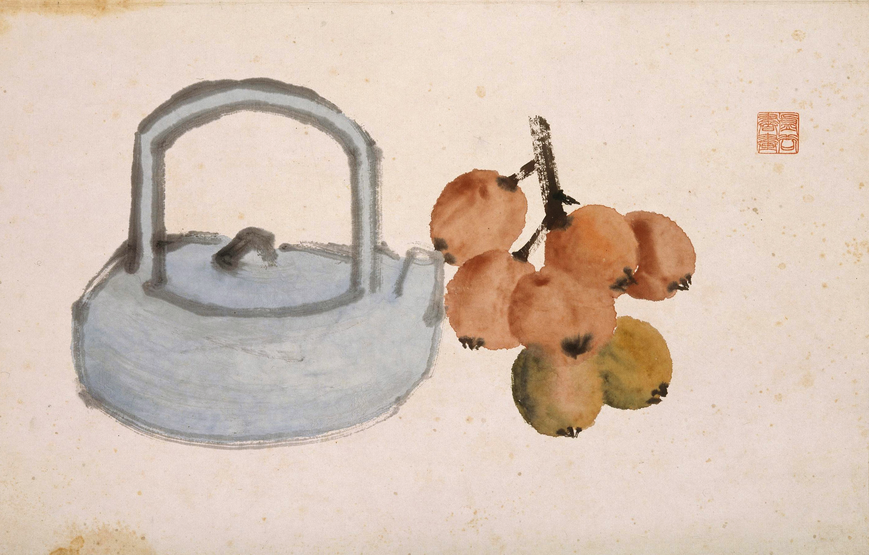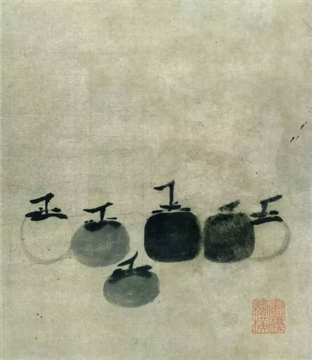 这股拙趣不知为何让我想起了牧溪的《六柿图》,那是一幅我非常喜欢的作品,这种精神心境而带来的笔法上的“形变”充满画意,同样简单的作画对象中,必然要进入对空间布局结构的推敲思索,必然要考虑最后的呈现,不同于牧溪的地方在于,虚谷十分重视表现刻画对象内在的生机,而牧溪《六柿图》则应以禅画的标准去理解:借用笔墨,写出心灵的声息,明证广博的精神世界,从小处着手,描绘的却是宇宙的本源,对世界枯荣的参悟,也就是大道至简;