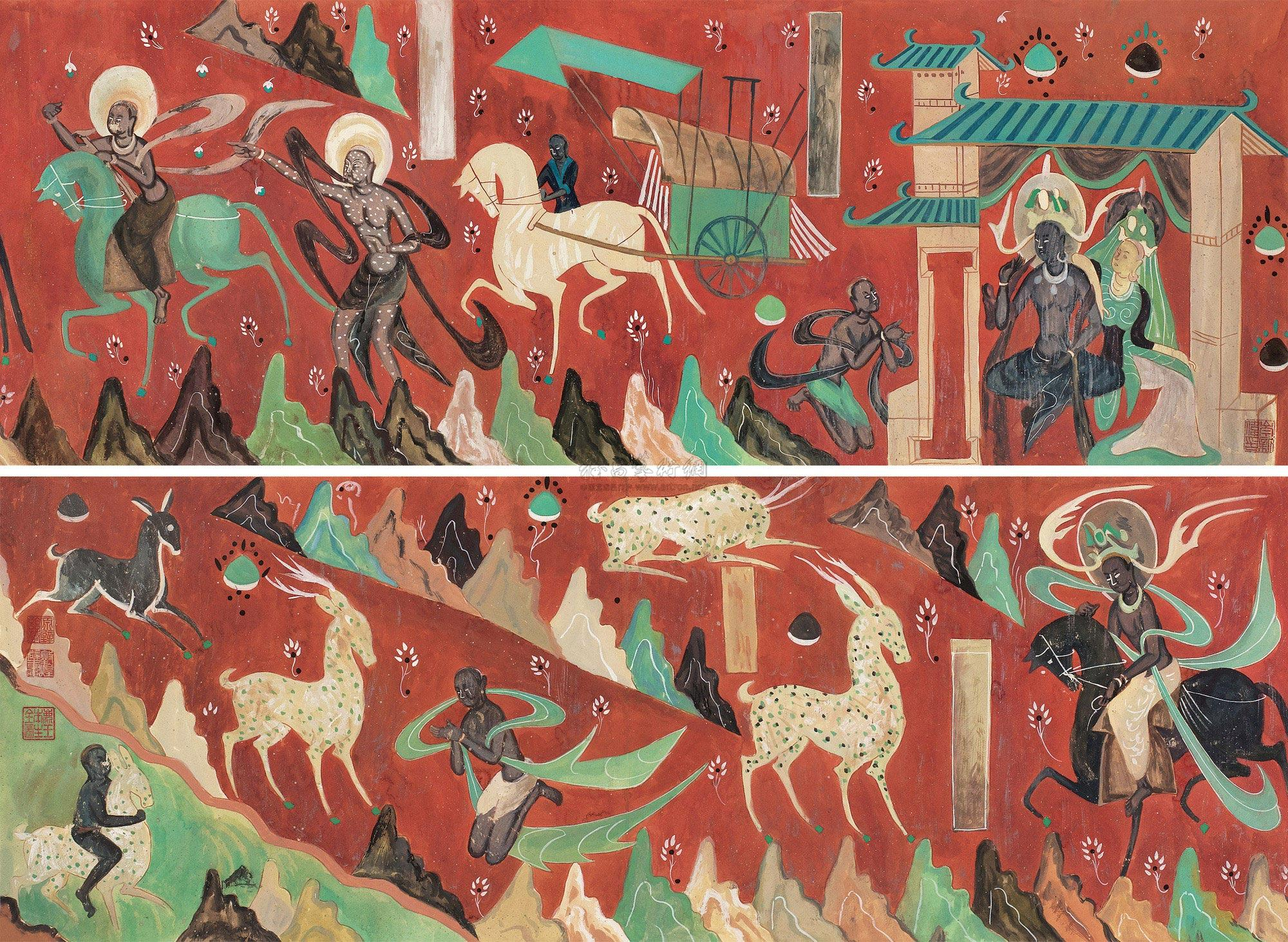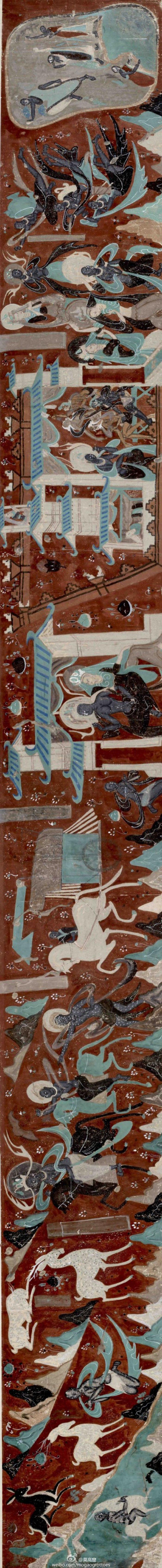 传说从前在印度的恒河岸边,有一只美丽而善良的九色鹿王。一天,九色鹿王正在河边悠闲散步,突然听到河里传来凄惨的呼救声。勇敢的九色鹿,不顾自身的安危,纵身跳入河中,顽强地与恶浪搏斗,终于把落水人调达救上岸来。调达庆幸自己的再生,感激涕零,向九色鹿频频叩头道谢。九色鹿王说:“不必谢了,回去吧,亲爱的调达,我只希望你不要向任何人透露我的行踪。”调达发誓说:“恩人啊,请你放心。如果我背信弃义,就叫我浑身长满烂疮,嘴里散发出恶臭。”说完就走了。在途中,调达见到了一张国王悬赏捕捉九色鹿的布告,说摩因先王的王后因梦见美丽的九色鹿而想马上得到它,谁能捉到九色鹿或知道九色鹿在哪里,报告国王,就可以领赏。忘恩负义的调达见利忘义,立即前去告密,并带领国王的大批兵马去捕捉九色鹿。处于重重包围中的九色鹿,猛然跳到国王面前,呈述了救调达及调达背叛誓言的经过。九色鹿的呈述,深深地感动了国王及士兵,大家那愤怒而厌恶的目光一起射向忘恩负义的小人—调达。调达无地自容,刹时间在他身上长满了烂疮,嘴里散发着恶臭,从此永远受到人们的鄙弃和唾骂。国王非常惭愧,愤怒地斥责调达,并下令全国,以后任何人都不准伤害九色鹿。王后贪婪的欲望落空了,她又羞又恨,最后也心碎而死。原图横置版:下面这张长图是带水印的,源自莫高窟的官方微博,值得一提的是,《鹿王本生图》作为长卷式构图的壁画,它的叙事结构和《洛神赋》不一样,它的叙事顺序是从长卷的左右两端开始往中间叙事,左侧描绘九色鹿救起落水人、落水人长跪致谢等情节,右侧描绘王后要求国王给她捕杀九色鹿、落水人告密、落水人引国王军队去树林,中央的主要位置画九色鹿向国王诉说救落水人的经过,不过我在展示上仍然还是从右至左放置: