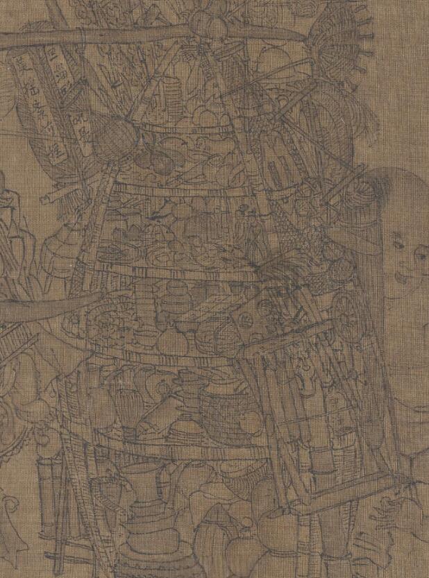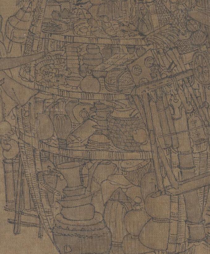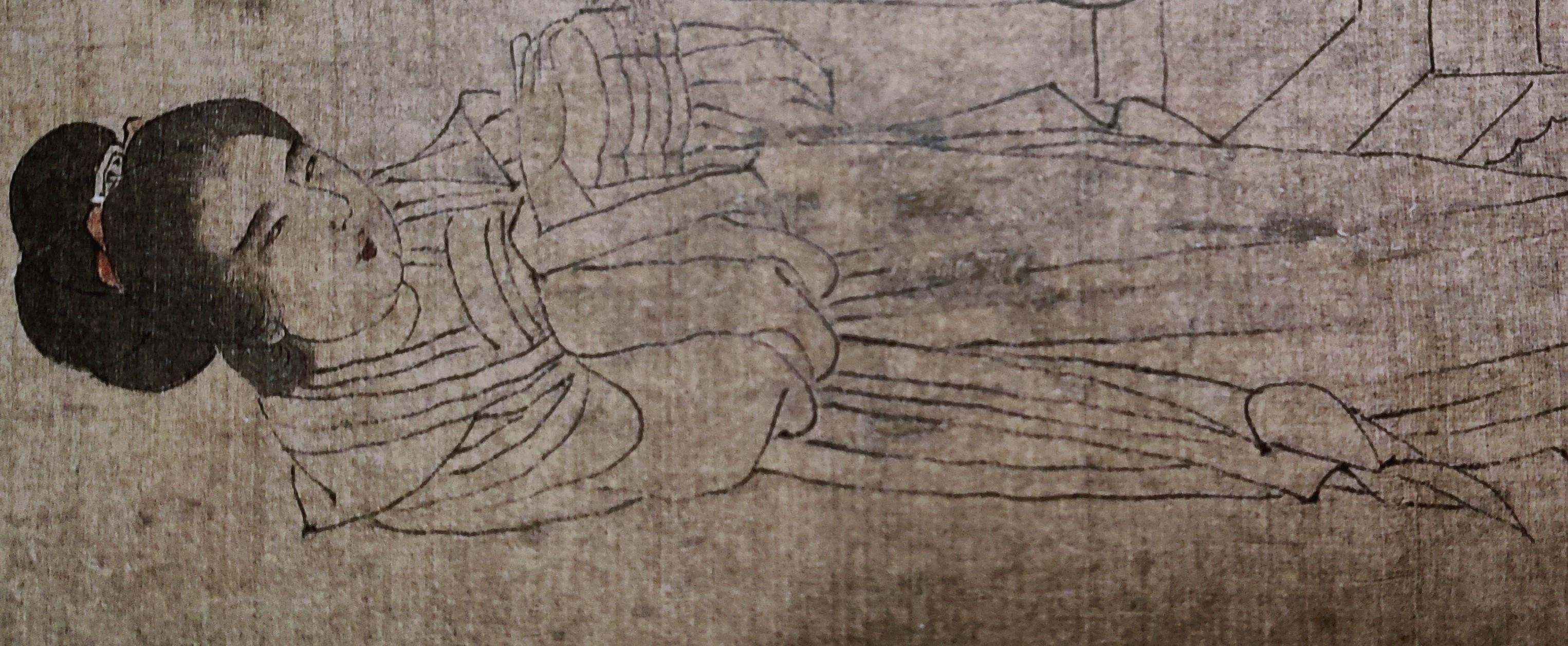 虽然这幅画我没有弄到更高清的网络资源,但依我手上的几本扫描版画册来看,有些小局部线条质量还是不够好,比如这个宫女身上的线条能感受到画的时候笔有点抖抖嗖嗖的没控制住,不够流畅,根据整幅其他优质的线条对比,也基本可以排除这种线条是画家刻意为之的风格效果,确定就是宋人临摹周文矩因笔力不足的画面失误;