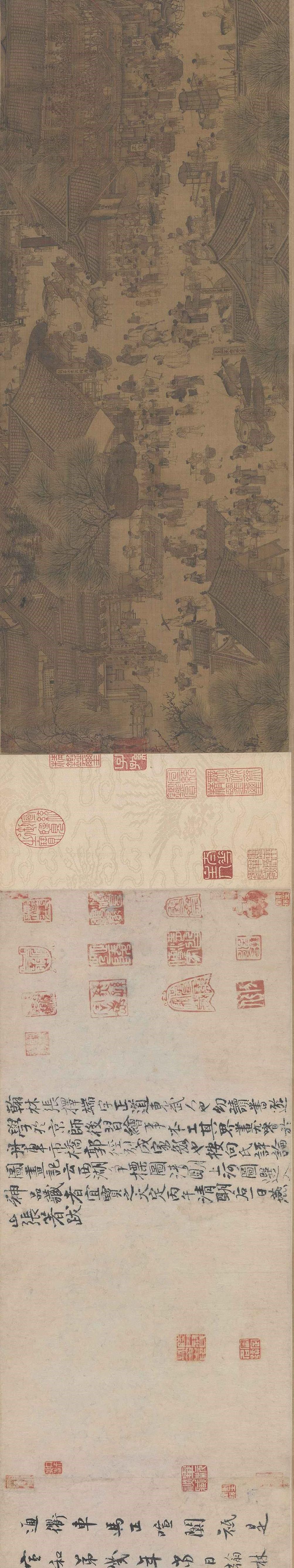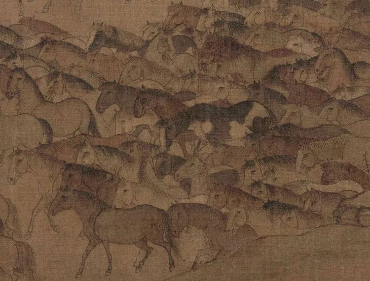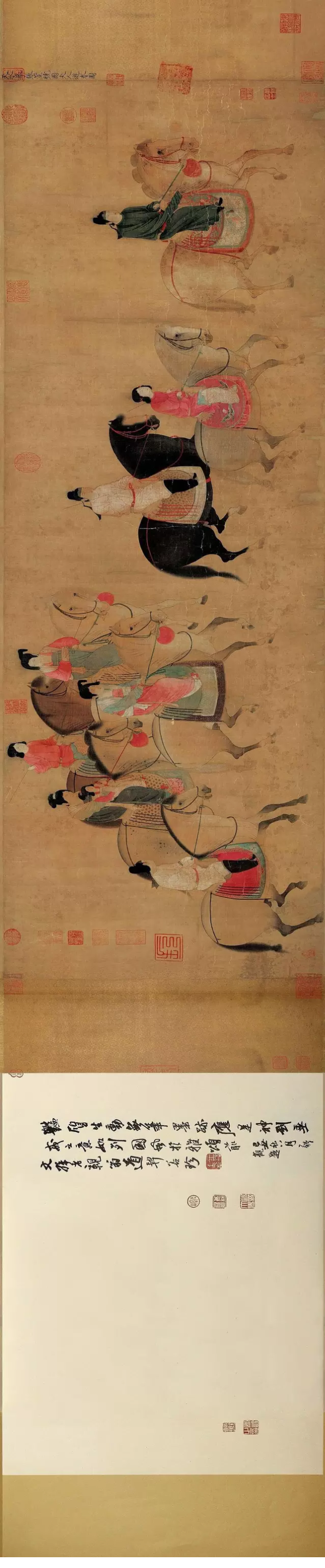现在看到的这个版本是宋人的摹本,这幅画最后的信息是藏于清末收藏家完颜景贤手中(画卷的最后一份题跋),后至今不知为何流落至美国的波士顿艺术博物馆,有意思的是,据黄庭坚《画记》所载,这摹本并非原版,原版是没有两匹马和奚官的,这幅画只画了原版的一半,是宋人根据残卷的临摹;
