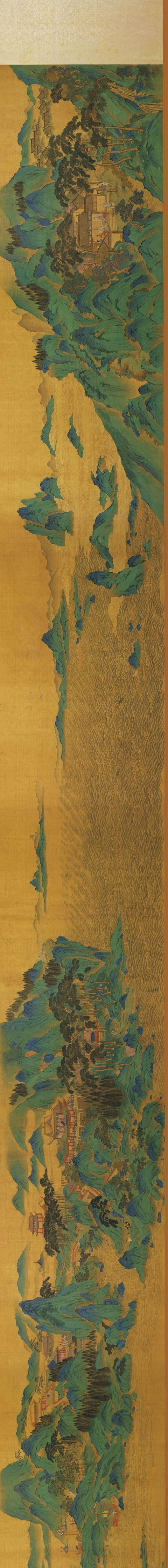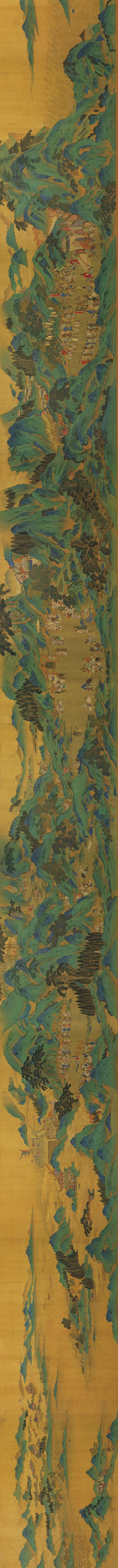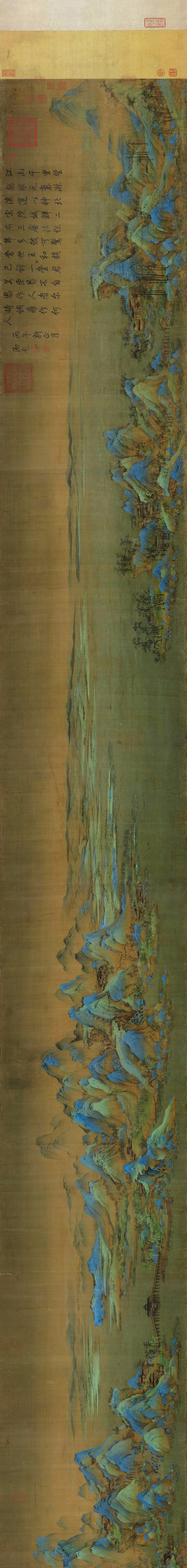 这篇回答的第一幅青绿山水我没有选择隋朝的《游春图》,因为我更喜欢这幅,蜀道难,丘壑峭削,千岩竟秀,画面笔力遒劲,山石构写繁复,山石整体的气度不凡,空间纵深广博,且利用散点透视人物描叙得当,且能用色彩区分山石的阴阳向背关系,这些其实在现在来看都不是什么亮点,但结合年代而言实属不易,此画原名是《宋人关山行旅图》,由《石渠宝笈》三编所定名,后经当代考证此画为安史之乱时李隆基往蜀中逃难的情景,因此改名《明皇幸蜀图》,台北故宫还有一幅同题材构图的画叫《春山行旅图》,水平较之这张要差不少,两张都传是李昭道所作,说系出同一母本,我把不准,故列佚名