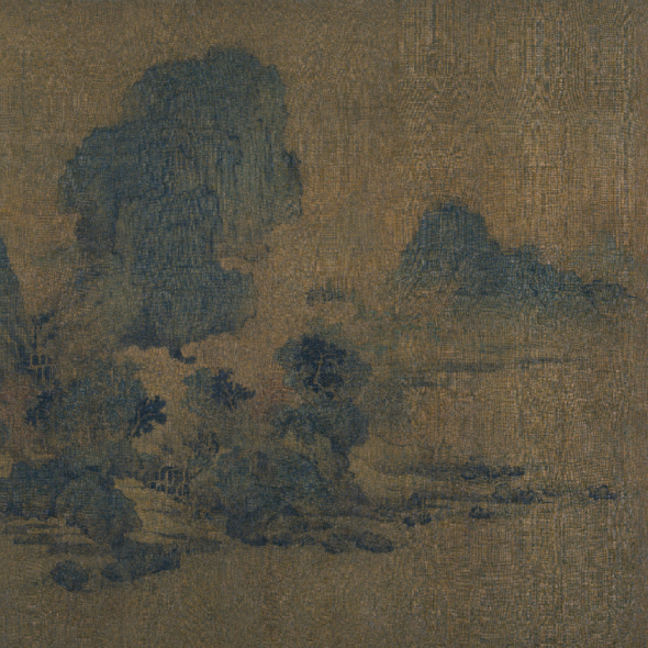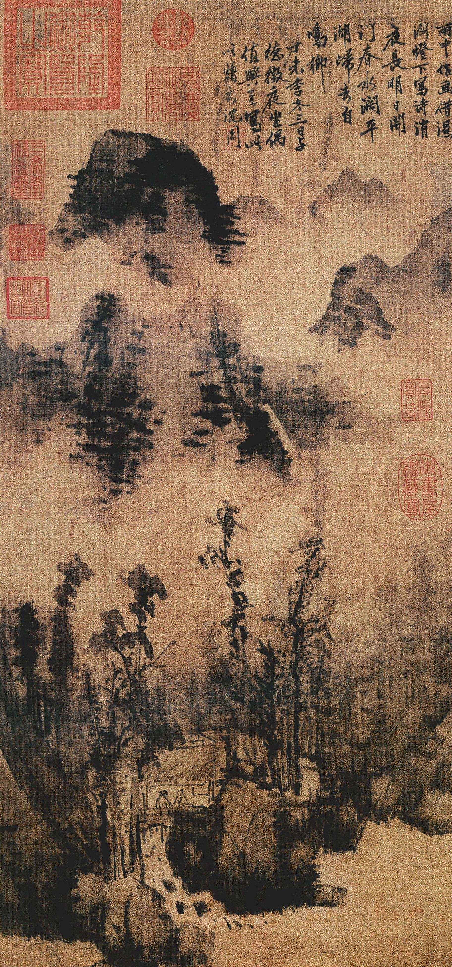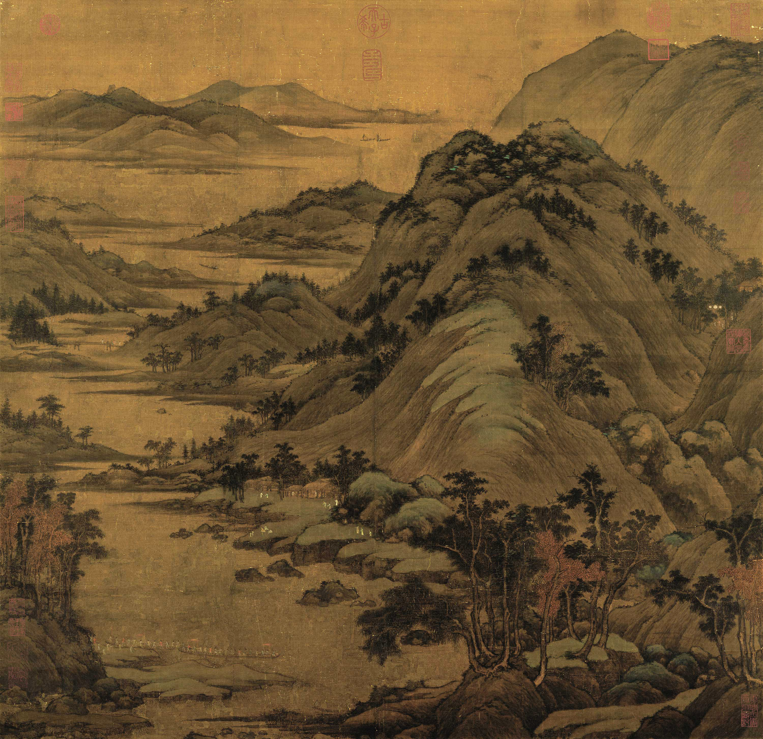 这篇回答的第一幅青绿山水我没有选择隋朝的《游春图》,因为我更喜欢这幅,蜀道难,丘壑峭削,千岩竟秀,画面笔力遒劲,山石构写繁复,山石整体的气度不凡,空间纵深广博,且利用散点透视人物描叙得当,且能用色彩区分山石的阴阳向背关系,这些其实在现在来看都不是什么亮点,但结合年代而言实属不易,此画原名是《宋人关山行旅图》,由《石渠宝笈》三编所定名,后经当代考证此画为安史之乱时李隆基往蜀中逃难的情景,因此改名《明皇幸蜀图》,台北故宫还有一幅同题材构图的画叫《春山行旅图》,水平较之这张要差不少,两张都传是李昭道所作,说系出同一母本,我把不准,故列佚名