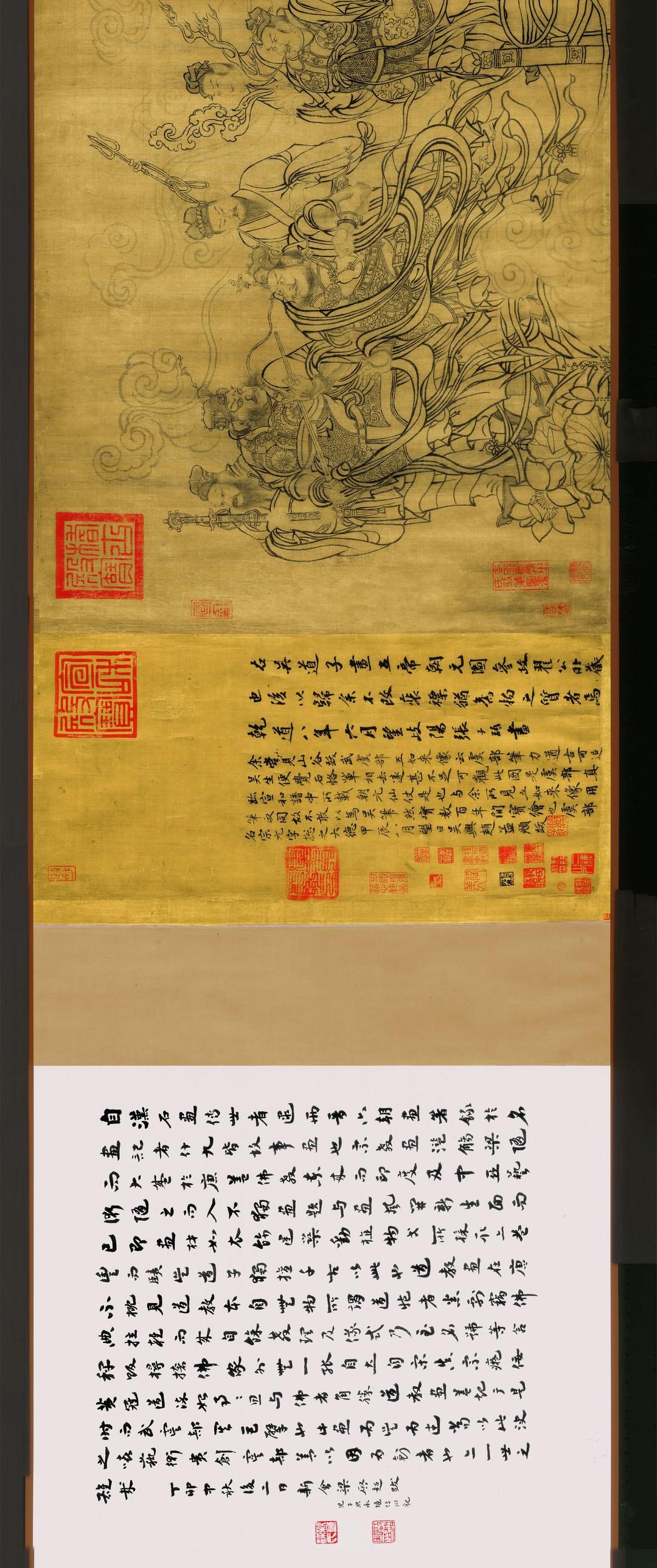 这件作品的线条来看,对比《送子天王图》的线条,我认为最起码不是吴道子的真迹,不是说它不好,而是线条层面水平差太多了,这里的水平考虑到了疏体密体取法有别,不过站在“唐派”的观点,这幅作品搭配武宗元的《朝元仙仗图》来看也佐证了美术史对于吴道子的高度评价:“吴道子的风格在宋代仍为众多画家所追逐向往,且都没有完全超出吴道子的范畴,吴道子时代所形成的的中国宗教绘画的基本样式,一直影响到元明以后,近代画工仍旧奉他为祖师”,就气韵生动而言,该作品的呈现仍深得神髓;