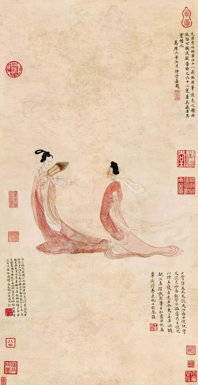 阎立本对于杨子华的评价十分精准:“简易标美,多不可减,少不可逾”,这幅画每分每毫都是恰到好处,笔墨细腻精美,设色古朴沉实,技法高超,尤其是校书人身上的纱披衫子(披襟),各位可以多加留意,三言两语几笔挥就出那种薄如蝉翼透明质感,原来早在北齐我们就有了这种用“高光”表现质感的素描写实意识(当然也可能是宋人自己加的);