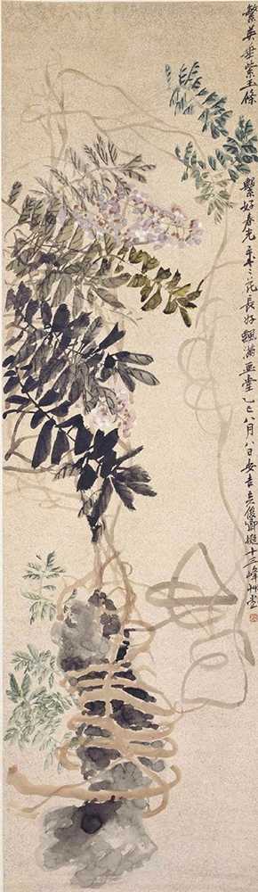 这幅画其实某种程度而言,是吴的非典型作品,可能是因为作于金笺之上的原因,让他平日的大气磅礴多了一丝工巧之气,最为代表性的藤枝在画中的浓度也弱了许多,但却在视觉上有种和谐,下方的藤枝做盘龙之势,浑厚酣畅,依旧是飞驰狂草的笔法,笔动走蛟龙,与上方的“岁月静好”有非常精巧的动静对比;(想看高清图可以去:吴昌硕紫藤图轴 - 故宫博物院)