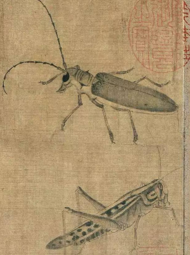 此图为手卷,是黄筌传世的重要作品。画家用细密的线条和浓丽的色彩描绘了大自然中的众多生灵,在尺幅不大的绢素上画了昆虫、鸟雀及龟类共24只,均以细劲的线条画出轮廓,然后赋以色彩。这些动物造型准确、严谨,特征鲜明。鸟雀或静立,或展翅,或滑翔,动作各异,生动活泼;昆虫有大有小,小的虽仅似豆粒,却刻划得十分精细,须爪毕现,双翅呈透明状,鲜活如生;两只乌龟是以侧上方俯视的角度进行描绘,前后的透视关系准确精到,显示了作者娴熟的造型能力和精湛的笔墨技巧,令人赞叹不已。——故宫官网