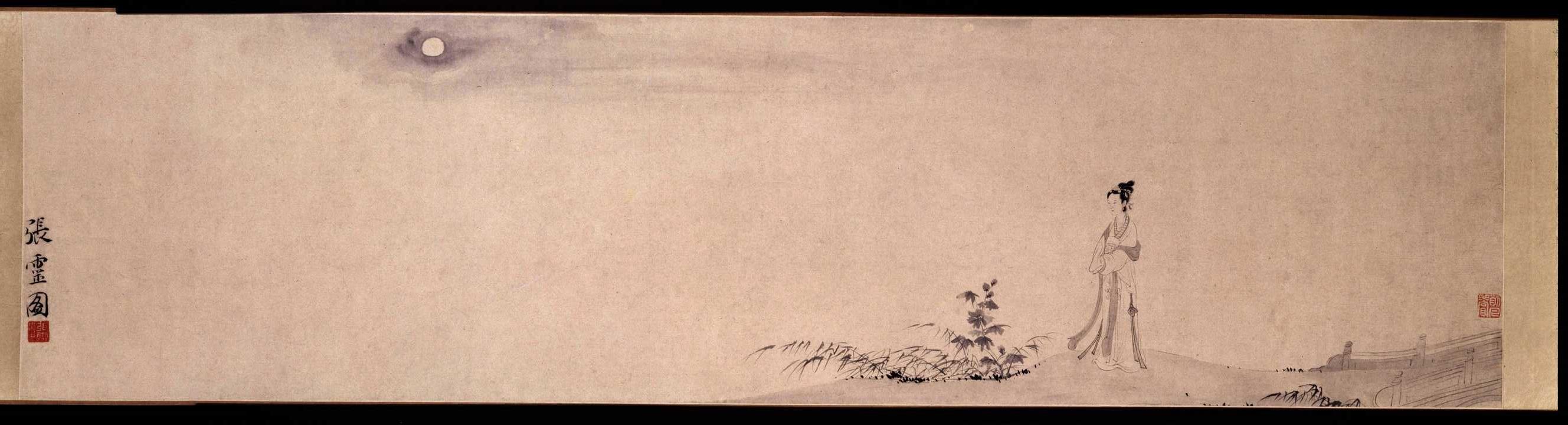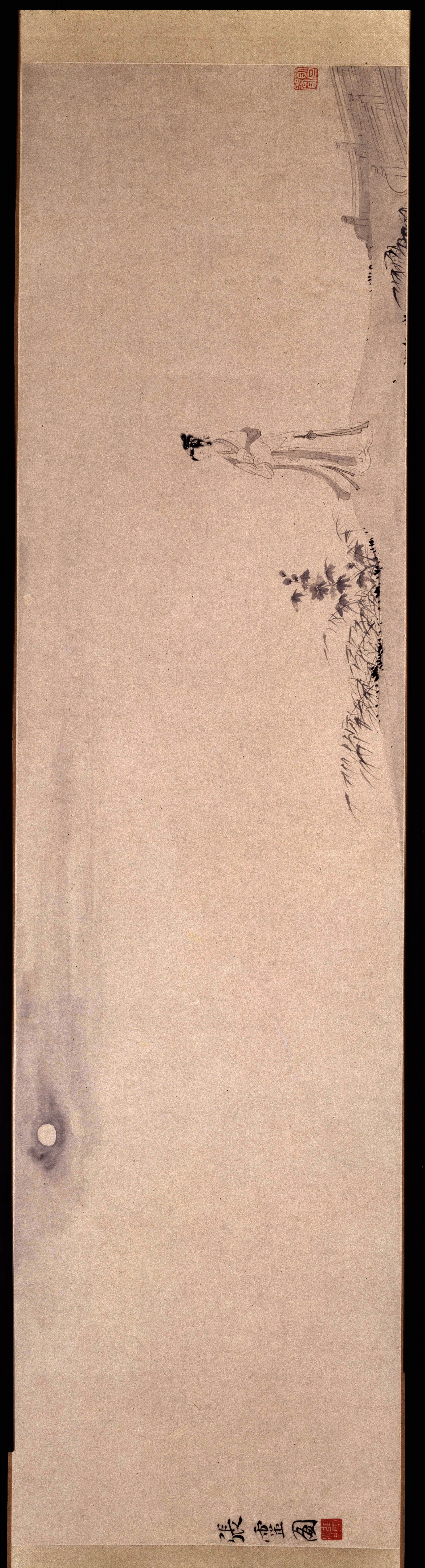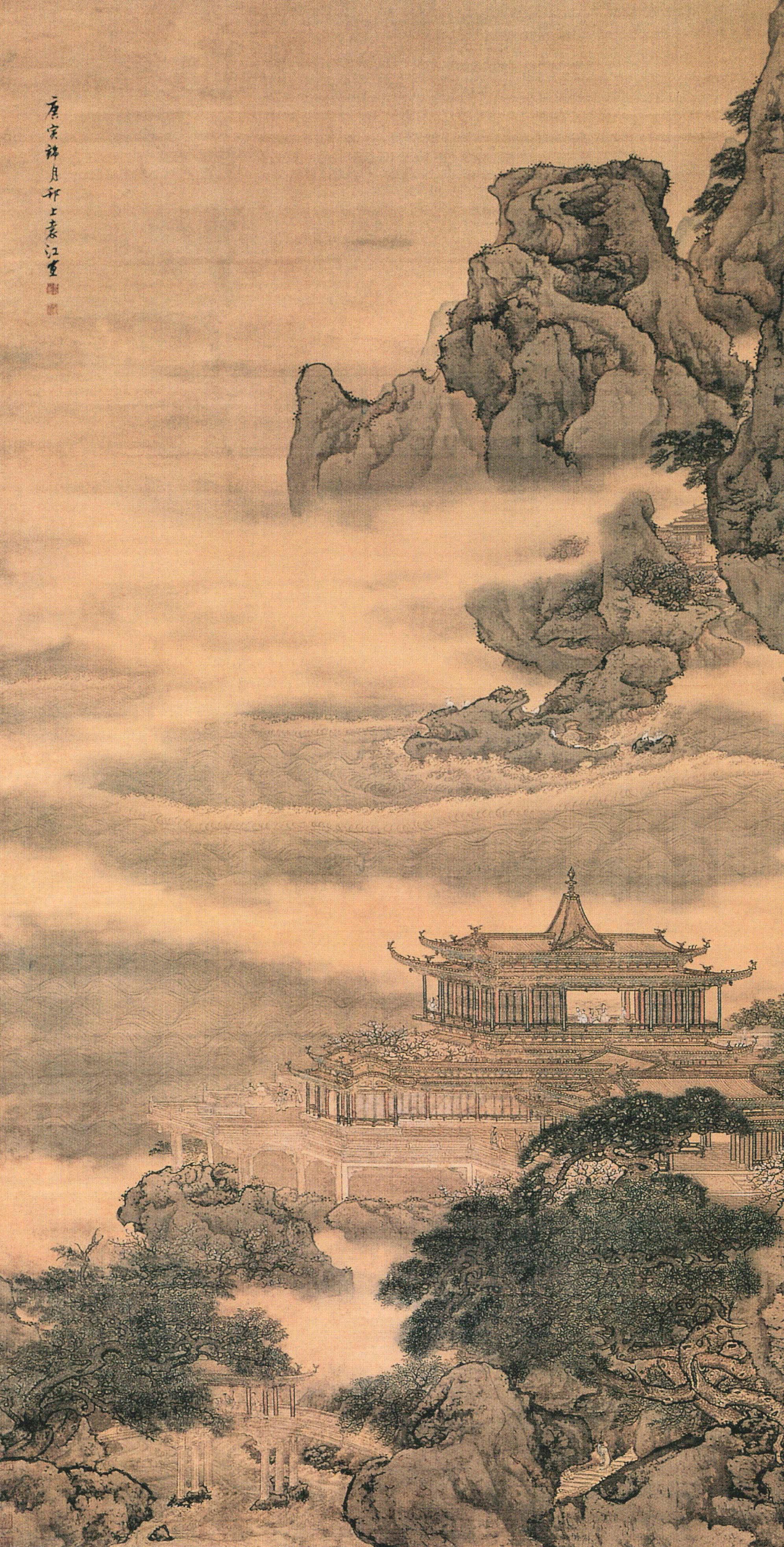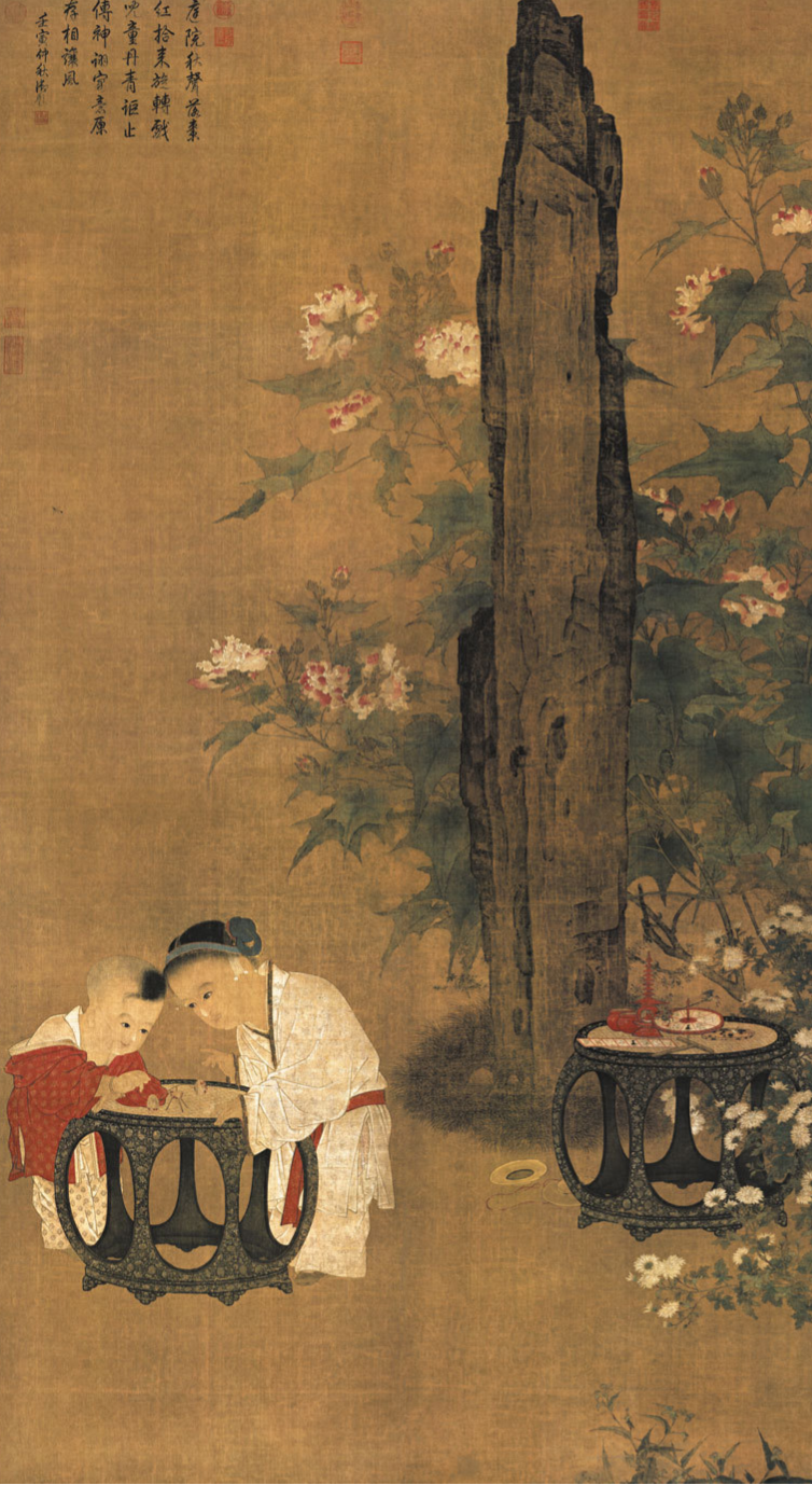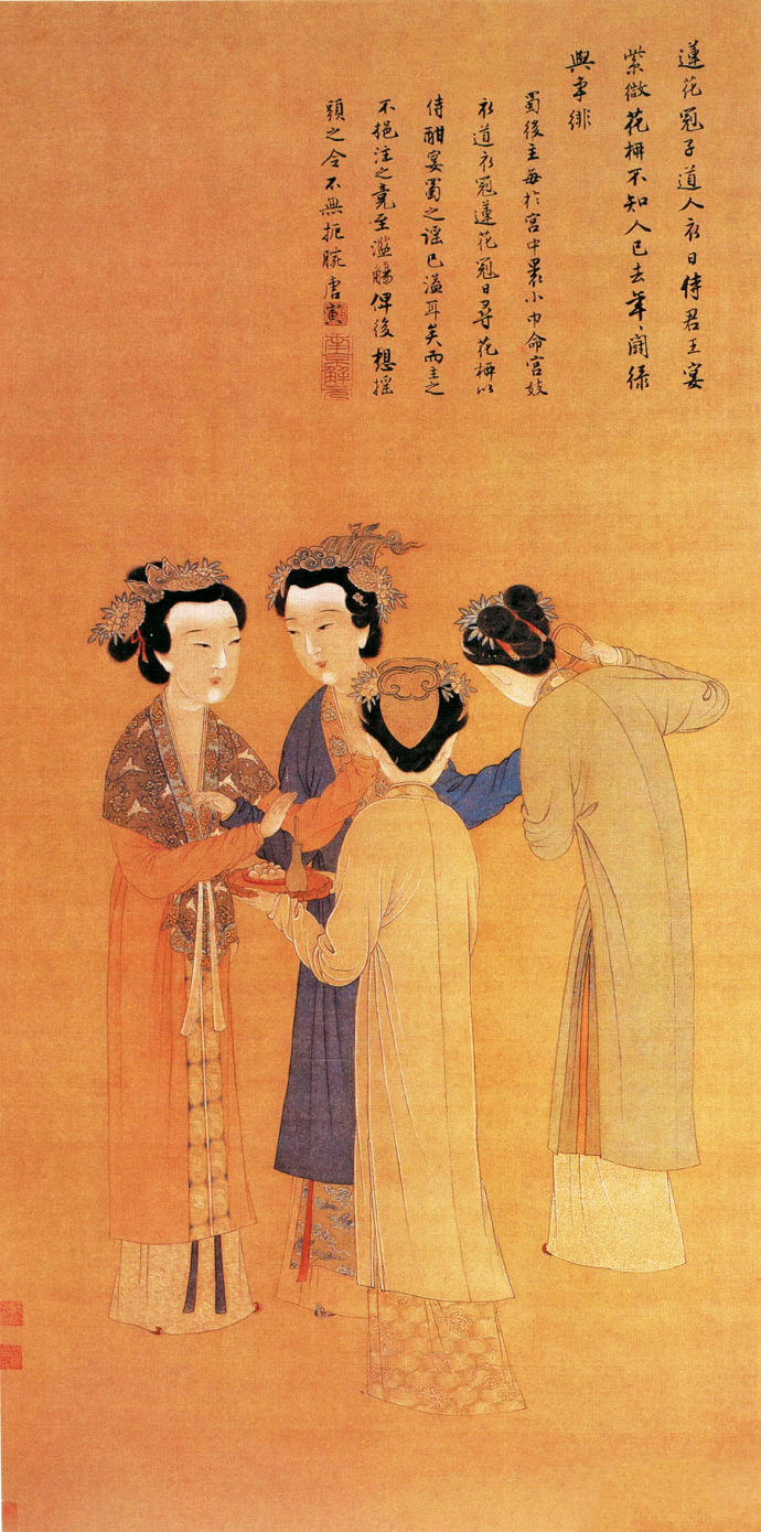 《仿周文矩宫中图》卷 ,绢本设色,26cm*146cm,该仿作的四个局部分藏于美国克利夫兰艺术博物馆、美国大都会博物馆、哈佛大学福格博物馆、意大利佛罗伦萨大学文艺复兴研究中心;