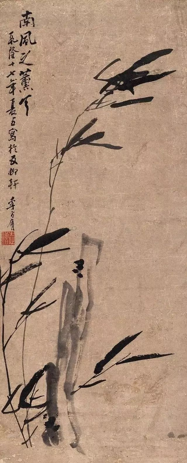 “画史从来不画风,我于难处夺天工。请看尺幅潇湘竹,满耳丁东万玉空”不过他说画史从不画风这一点不对,前面元朝顾安的《平安磐石图》其实就有画风之意,李方膺的仕途几经打击,甚至铃铛入狱,在他的另一首《风竹图》中,他的题诗更有将自己比作风中坚韧的竹子的隐喻,他的风中之竹系列我最喜欢的就是这幅《南风之熏竹》,简略而有力度;